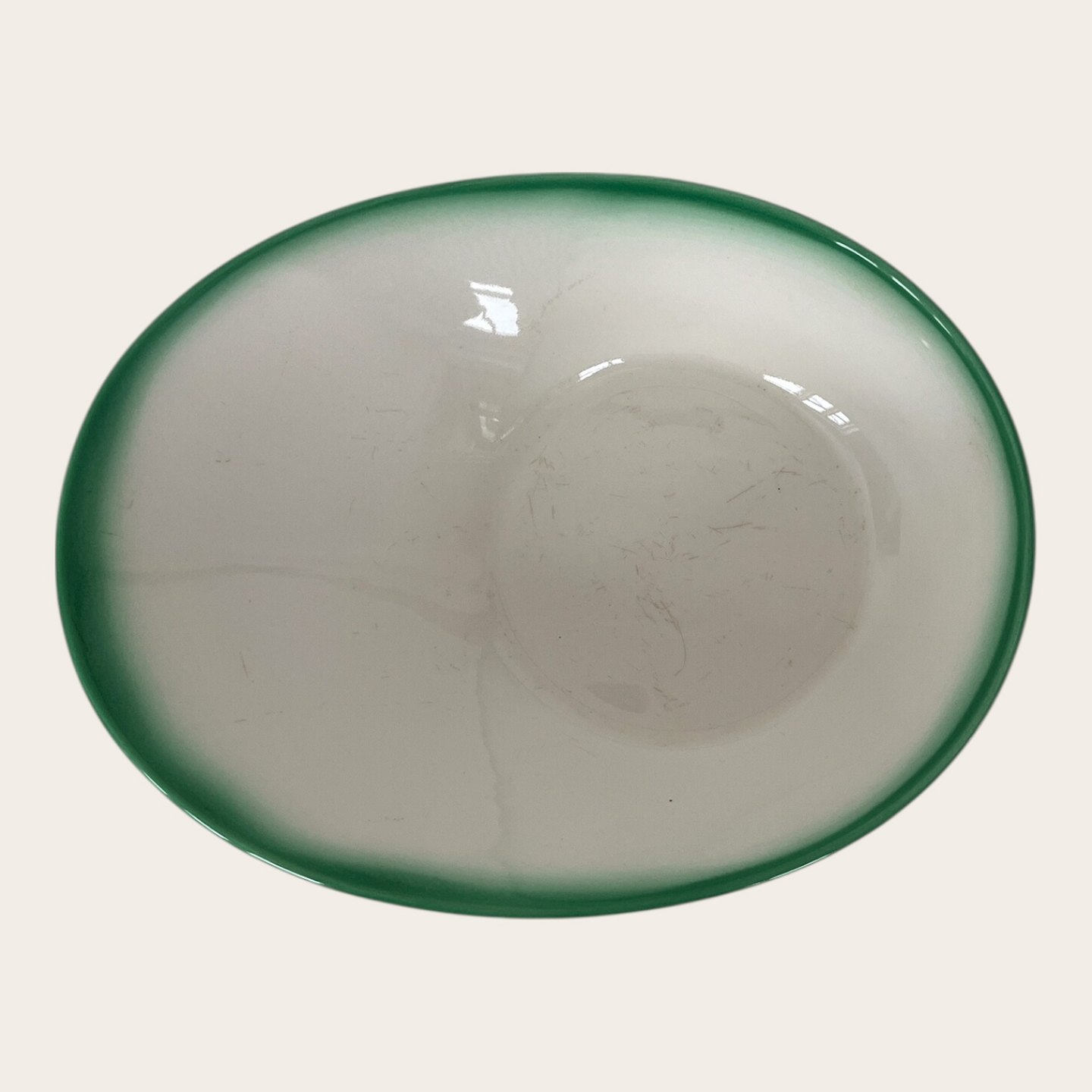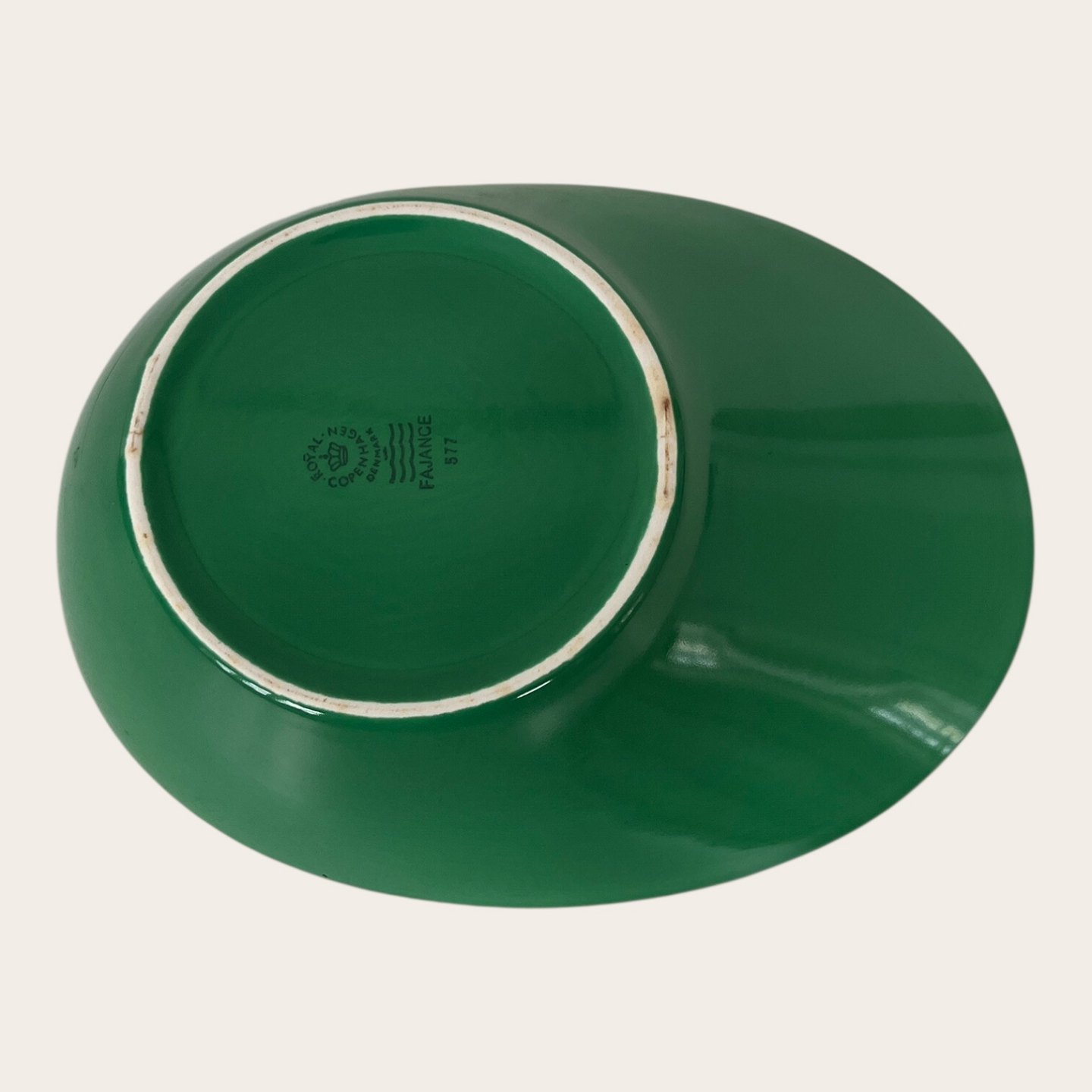 Royal Copenhagen / Aluminia, Ursula #577, Asymmetrisk grøn/ hvid skål, 1. sortering, 23,5cm lang, 18cm bred, 6cm høj, Design Ursula Munch Petersen *Med brugsspor*