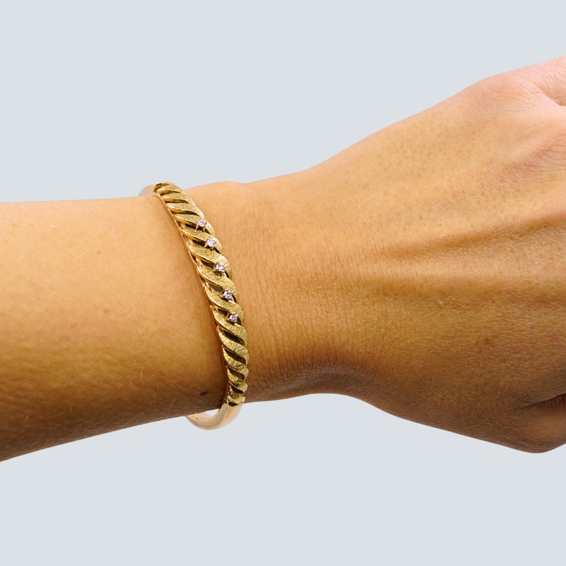 Guldarmring i 14 kt. prydet med fem diamanter, som er fattet i hvidguld. Indvendige mål 5,3 cm x 4,6 cm. B. 5-7 mm. Designet med både glat og materet overflade i guldet. Kraftig kvalitet.Stemplet "585".