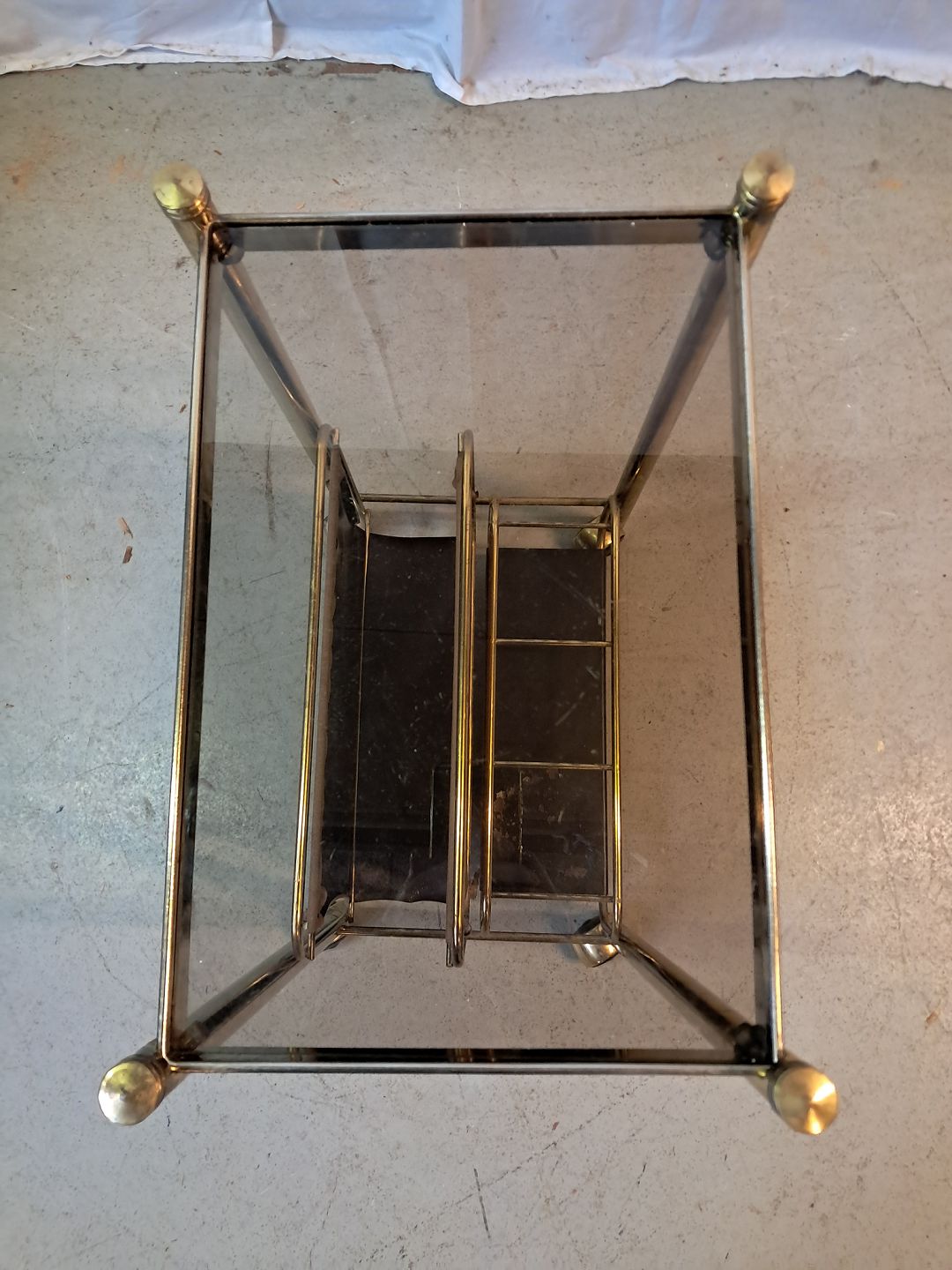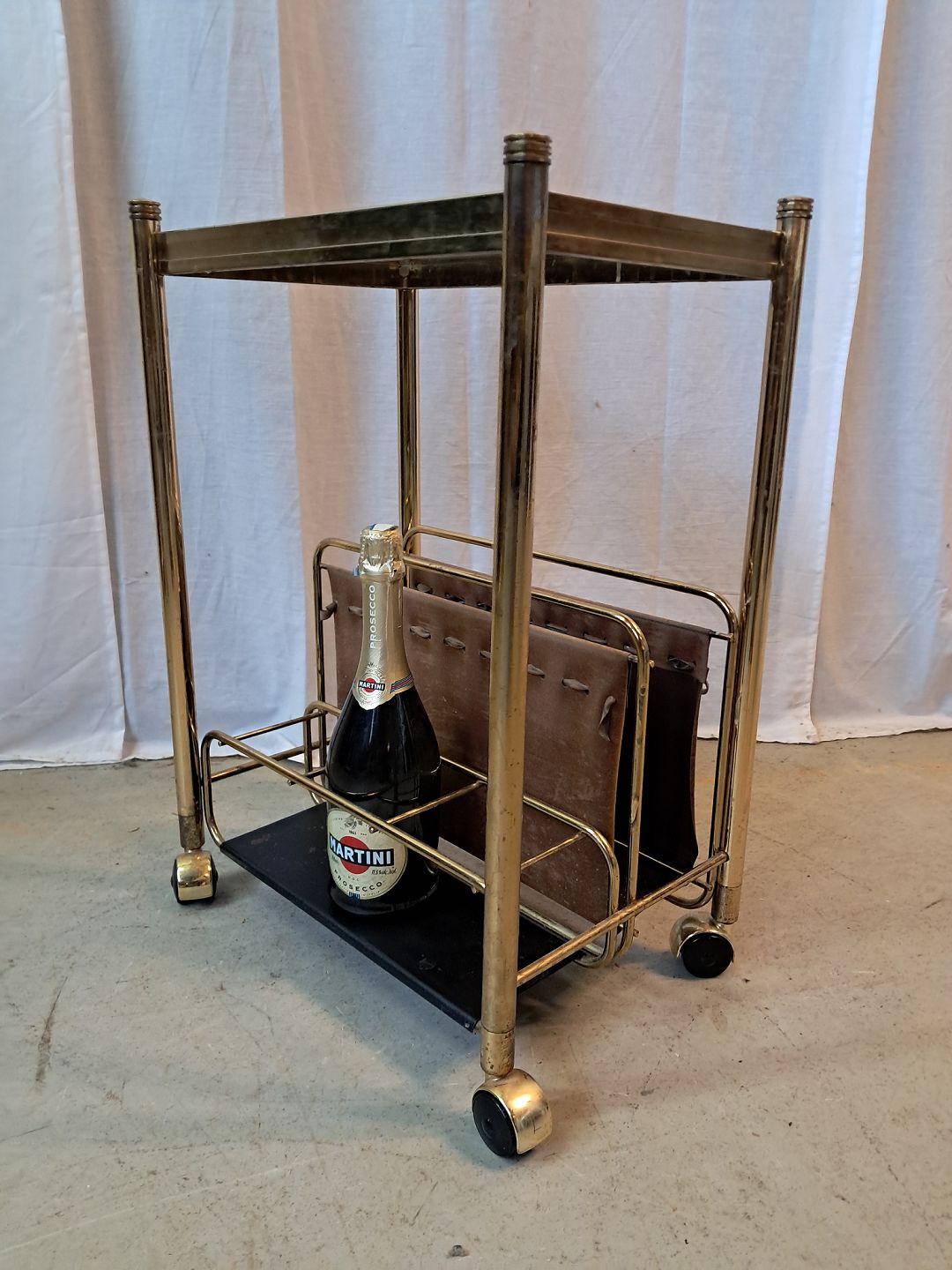 Bord i metal med magasinholder, flaskerum og glasplade, fra 1980erne.Det har brugsspor.