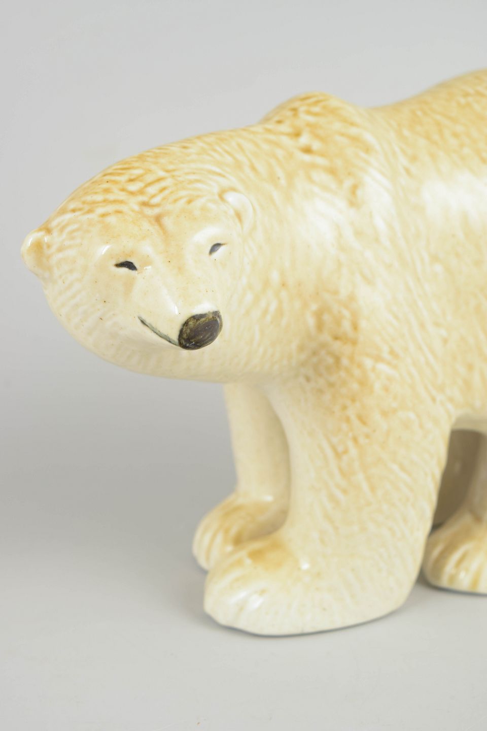Lisa Larson for Gustavsberg, isbjørn figur.Dekorativ dyrefigur i glaseret stentøj, udført som isbjørn med bløde, afrundede former og diskret bemaling i ansigtet. Figuren er udført i 1970’erne og har et enkelt, karakteristisk udtryk, hvor form og overflade fremhæver Lisa Larsons stil. Modellen er fra Skansen-serien.