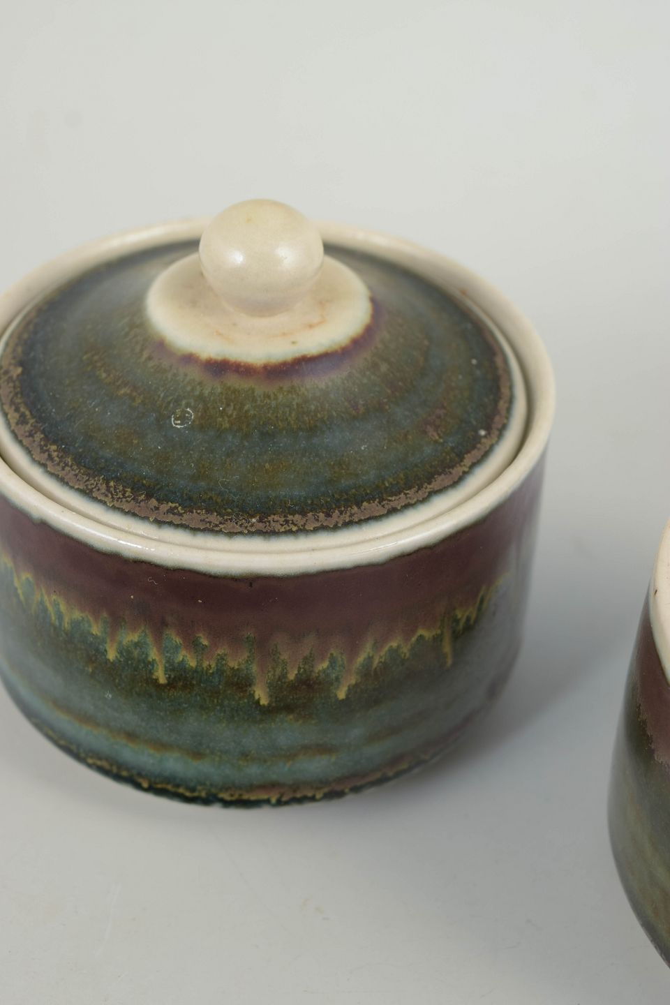 John Andersson for Höganäs, par lågkrukker.Par drejede lågkrukker i stentøj med cylindrisk form og tilpassede låg med knop. Udført med levende, flerlaget glasur i afdæmpede nuancer af grøn, blå og brun med lys rand og markant horisontalt glasurspil. Signerede i bunden og produceret hos Höganäs i 1970’erne.