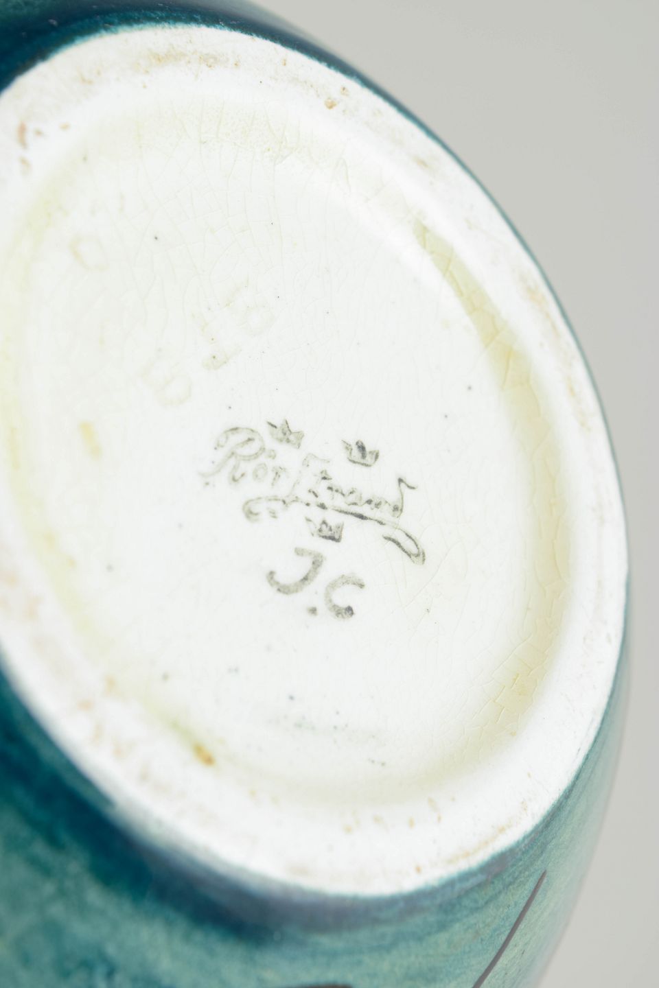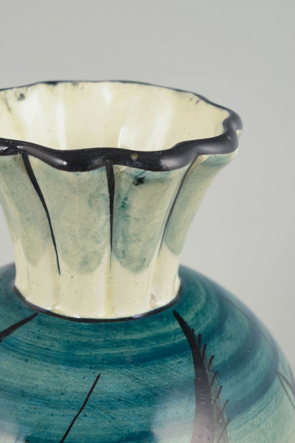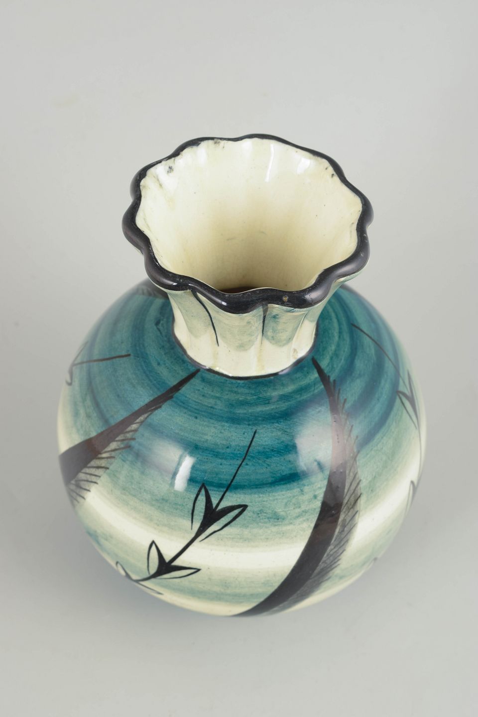 Ilse Claesson for Rörstrand, “Löja” vase.Art Deco-vase i fajance med balanceret, rund korpus og smal hals med let bølget rand. Dekoreret i karakteristiske blågrønne nuancer med stiliseret plantedekoration og fine penselstrøg, udført i den velkendte “Löja”-dekoration, udviklet i 1930’erne. Modellen fremstår som et klart eksempel på svensk Art Deco med inspiration fra naturformer og grafisk ornamentik.