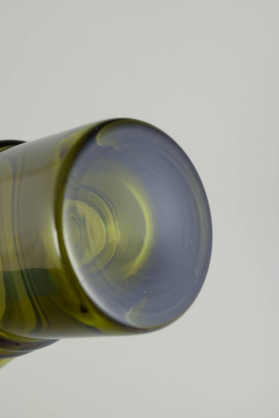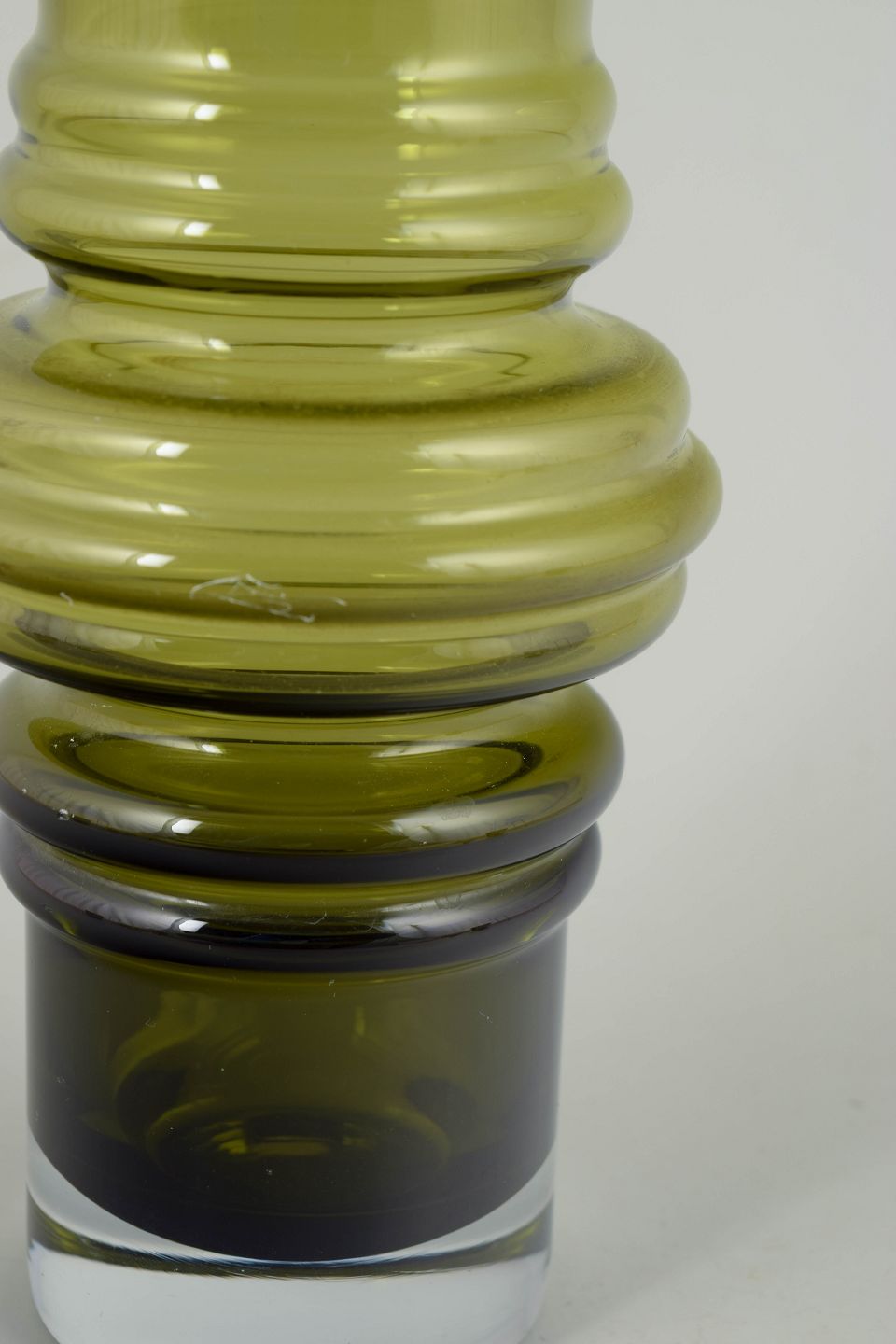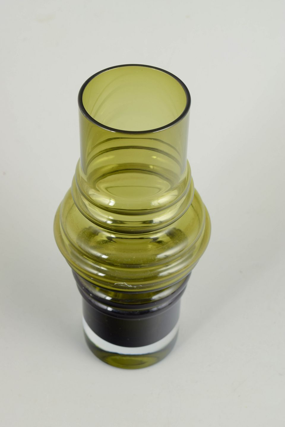 Tamara Aladin for Riihimäen Lasi, mundblæst kunstglasvase.Elegant vase i olivengrønt glas med balanceret, skulpturel profil og blød, afrundet form. Mundblæst udførelse med markeret, ringformet midterparti og cylindrisk overdel, typisk for finsk kunstglas fra 1970’erne.