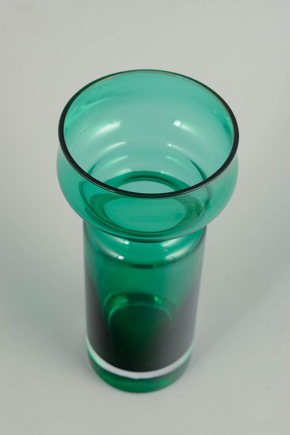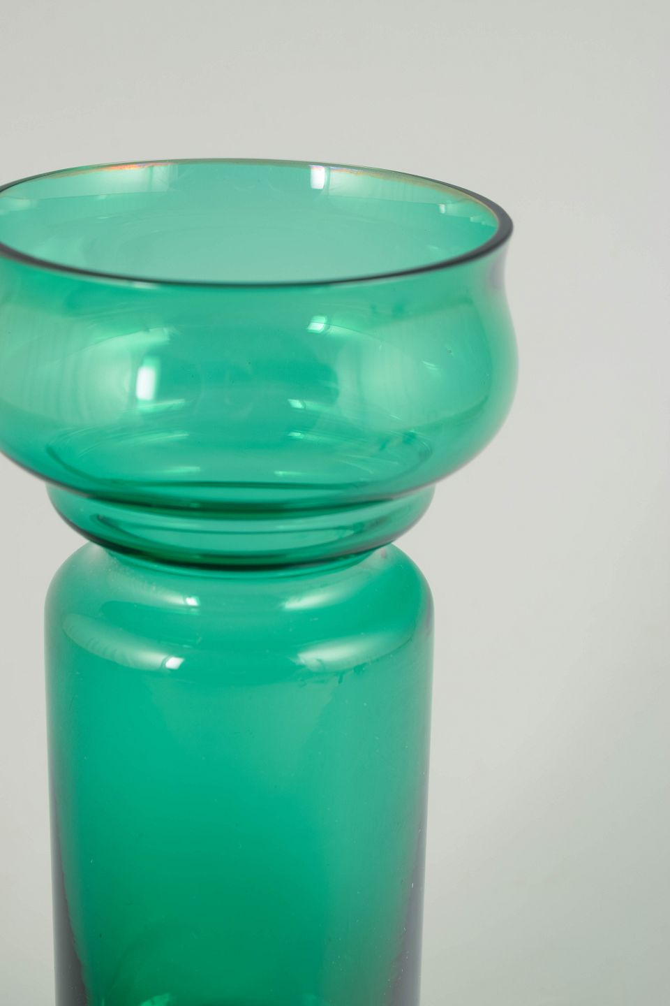 Tamara Aladin for Riihimäen Lasi, mundblæst kunstglasvase.Elegant vase i klart turkisgrønt glas med balanceret, skulpturel profil og blød, rundet form. Mundblæst udførelse med markeret skålformet overdel og cylindrisk underdel, typisk for finsk kunstglas fra 1970’erne.
