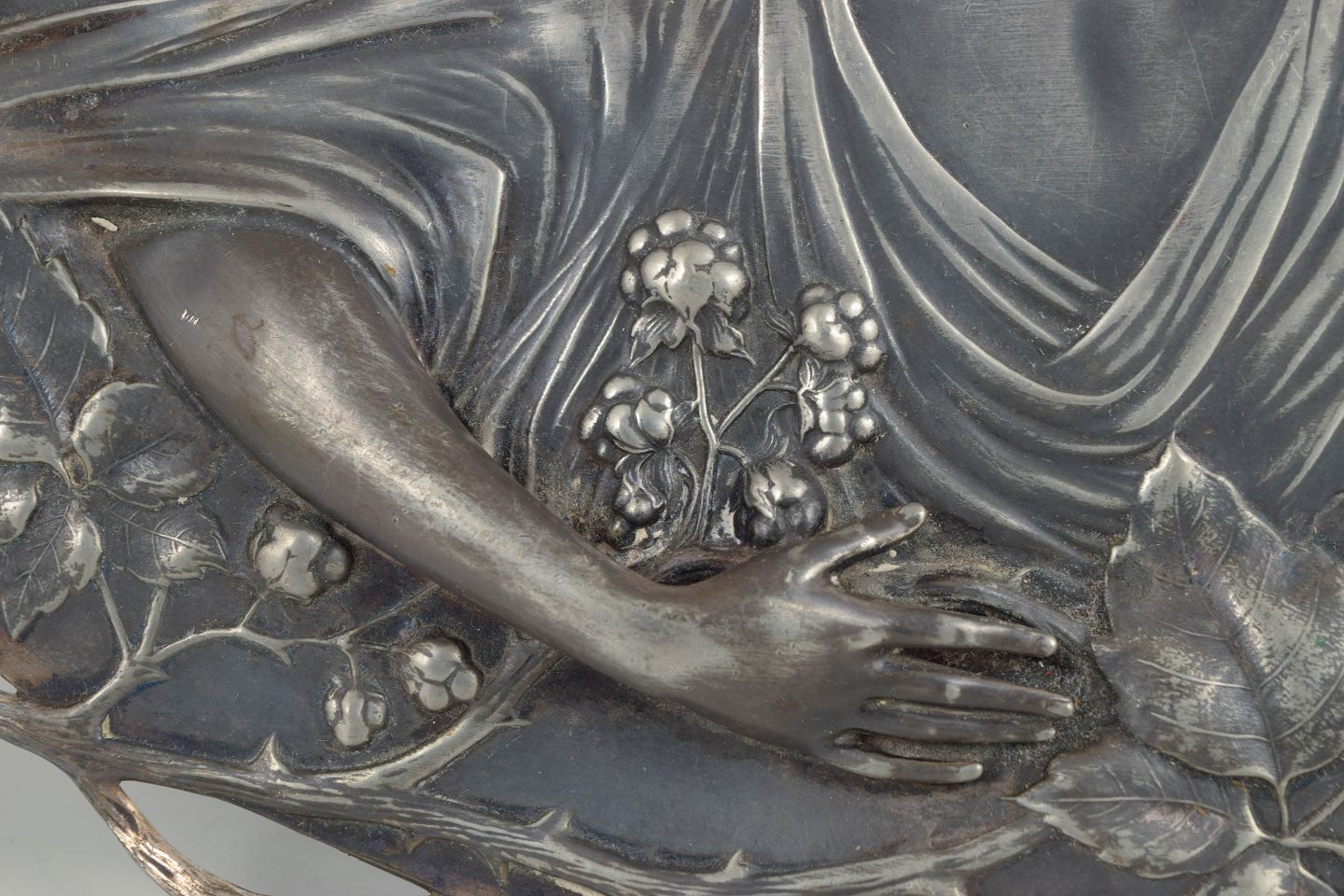 WMF, Tyskland, stort Art Nouveau vægrelief.Stort ovalt fad i sølvfarvet metal med reliefdekoration i klassisk jugendstil, forestillende en kvindefigur omgivet af slyngende blomster og blade. Elegant, skulpturel komposition med fine detaljer og blød linjeføring, karakteristisk for WMF’s produktion i perioden. Kan anvendes både som serveringsfad og som vægophæng. Signatur forekommer, men er ikke tydeligt læsbar.