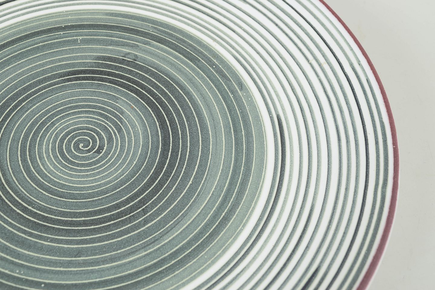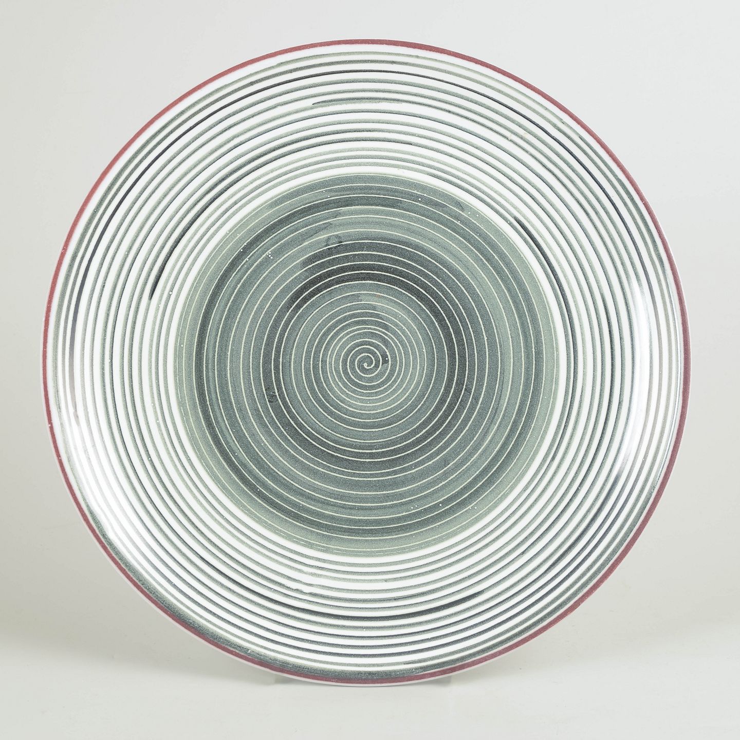 Hjördis Oldfors for Upsala-Ekeby, fad.Dekorativt fad i glaseret keramik med grafisk spiralornamentik i grågrønne nuancer og rød kant. Modellen fremstår med et stramt, tidstypisk formsprog fra 1930/40’ernes svenske modernisme og er angivet som model 53.