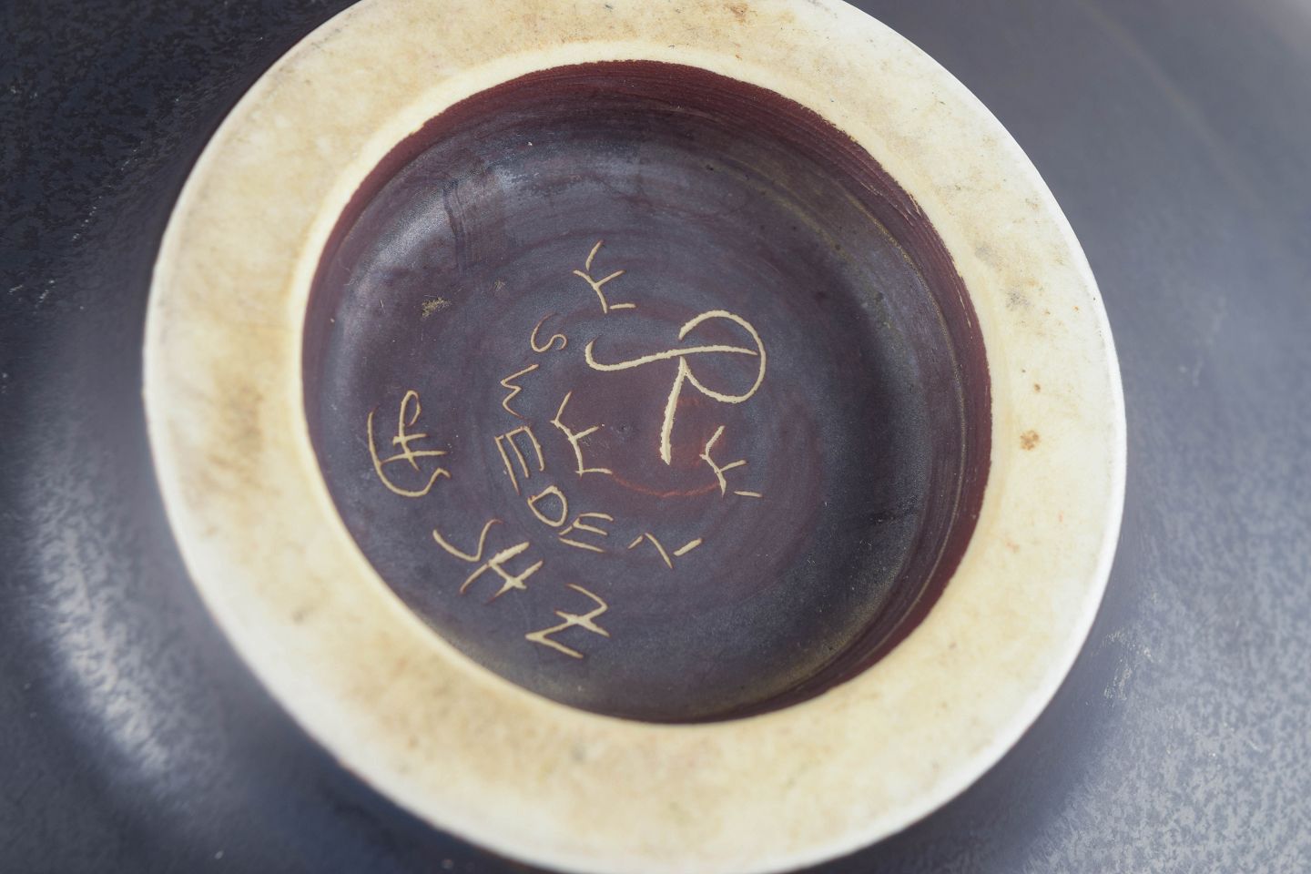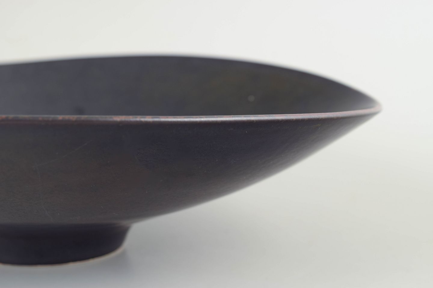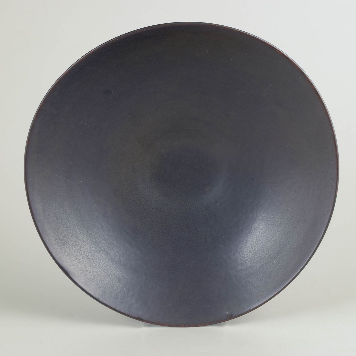 Carl-Harry Stålhane for Rörstrand, stor skål.Stor, lav skål i stentøj med bred, åben form og let hævet fodring. Udført i afdæmpet, mørk glasur med mat overflade, der fremhæver den rene silhuet og den sikre proportionering. Et karakteristisk eksempel på Carl-Harry Stålhanes modernistiske formsprog hos Rörstrand i midten af det 20. århundrede, hvor enkelhed og materialefornemmelse er i fokus.
