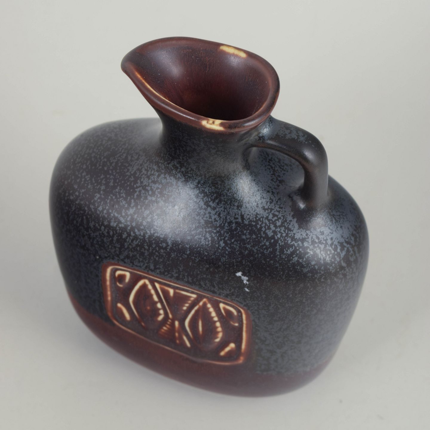 Gunnar Nylund for Rörstrand, kande.Kompakt og velafbalanceret kande i stentøj med afrundet, skulpturel form. Udført med karakteristisk mørk, fint spættet glasur i grålige og brunrøde nuancer, med integreret hank og let udadbøjet hældetud. Et klassisk eksempel på Gunnar Nylunds sikre proportionering og materialefølelse hos Rörstrand i midten af det 20. århundrede.