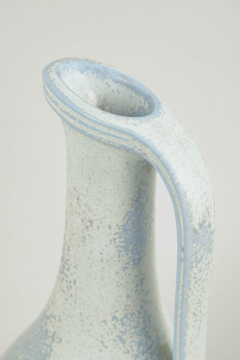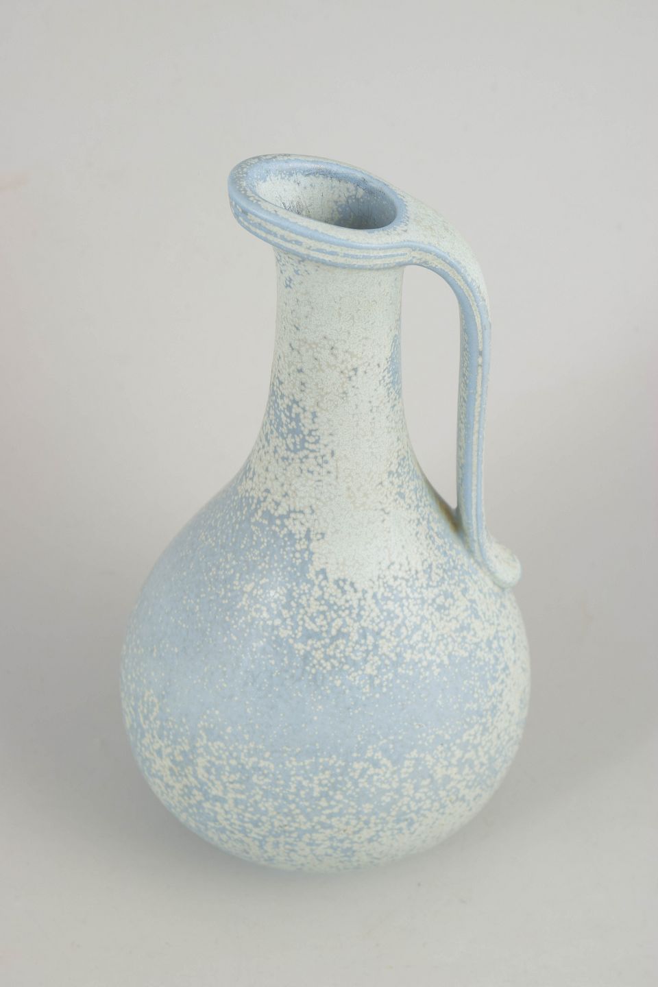Gunnar Nylund for Rörstrand, kande.Elegant og balanceret kande i stentøj med blød, organisk form. Udført med karakteristisk lys, spættet glasur i kølige blålige og cremefarvede nuancer, typisk for Gunnar Nylunds produktion hos Rörstrand i midten af det 20. århundrede. Harmonisk proportioneret med integreret hank og let udadbøjet hældetud.
