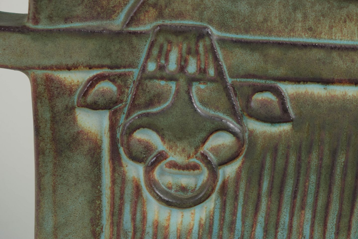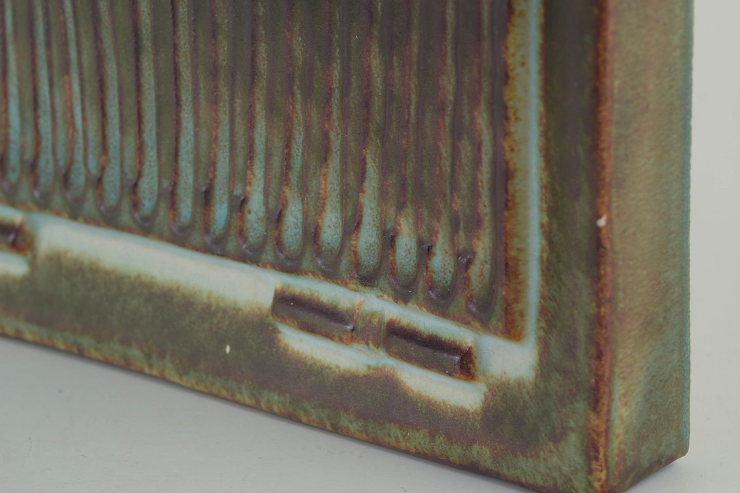 Andersson & Johansson for Höganäs, vægrelief.Relief i stentøj med stiliseret dyremotiv i lavt relief, udført i karakteristisk nordisk formsprog. Glasur i dæmpede jordtoner med grønne og brune nuancer, typisk for Höganäs’ produktion i perioden.