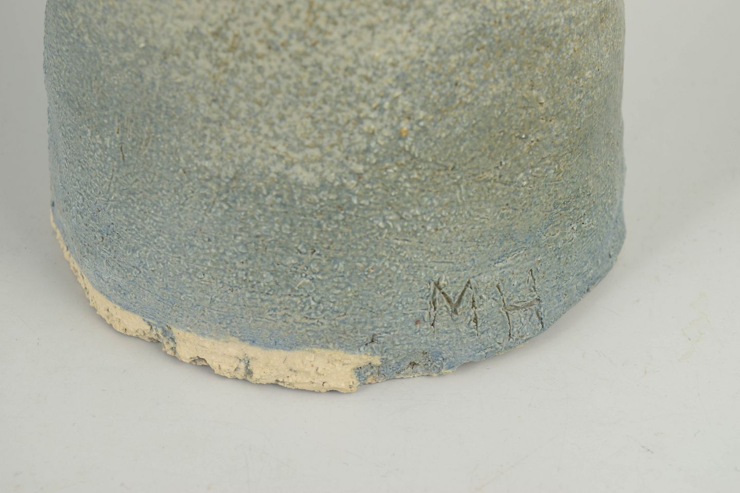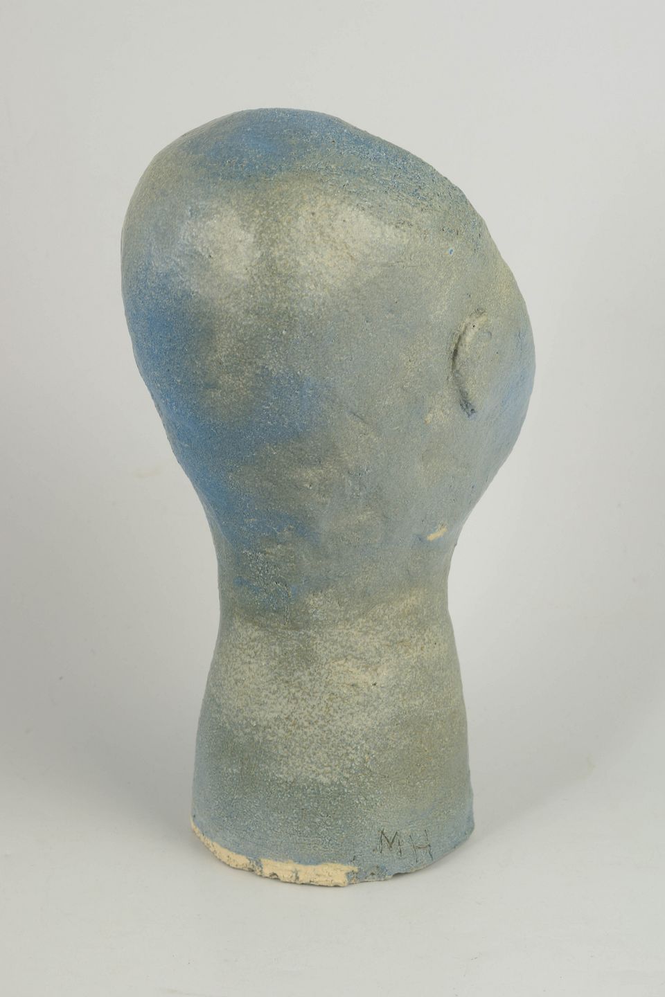 Unik, håndformet skulptur i stentøj med stiliseret hovedform og et roligt, skulpturelt udtryk. Overfladen er præget af en mat, let struktureret glasur i afdæmpede blå og grå nuancer. Signeret “M.H.”. Fremstår som et selvstændigt kunstnerisk værk inden for europæisk studiokeramik.