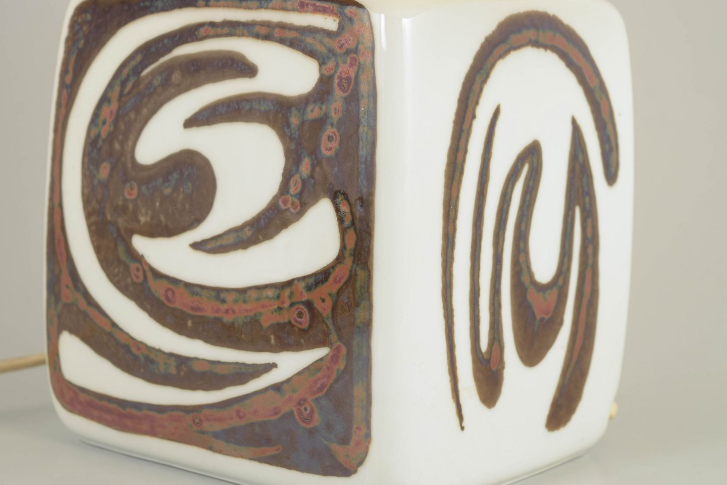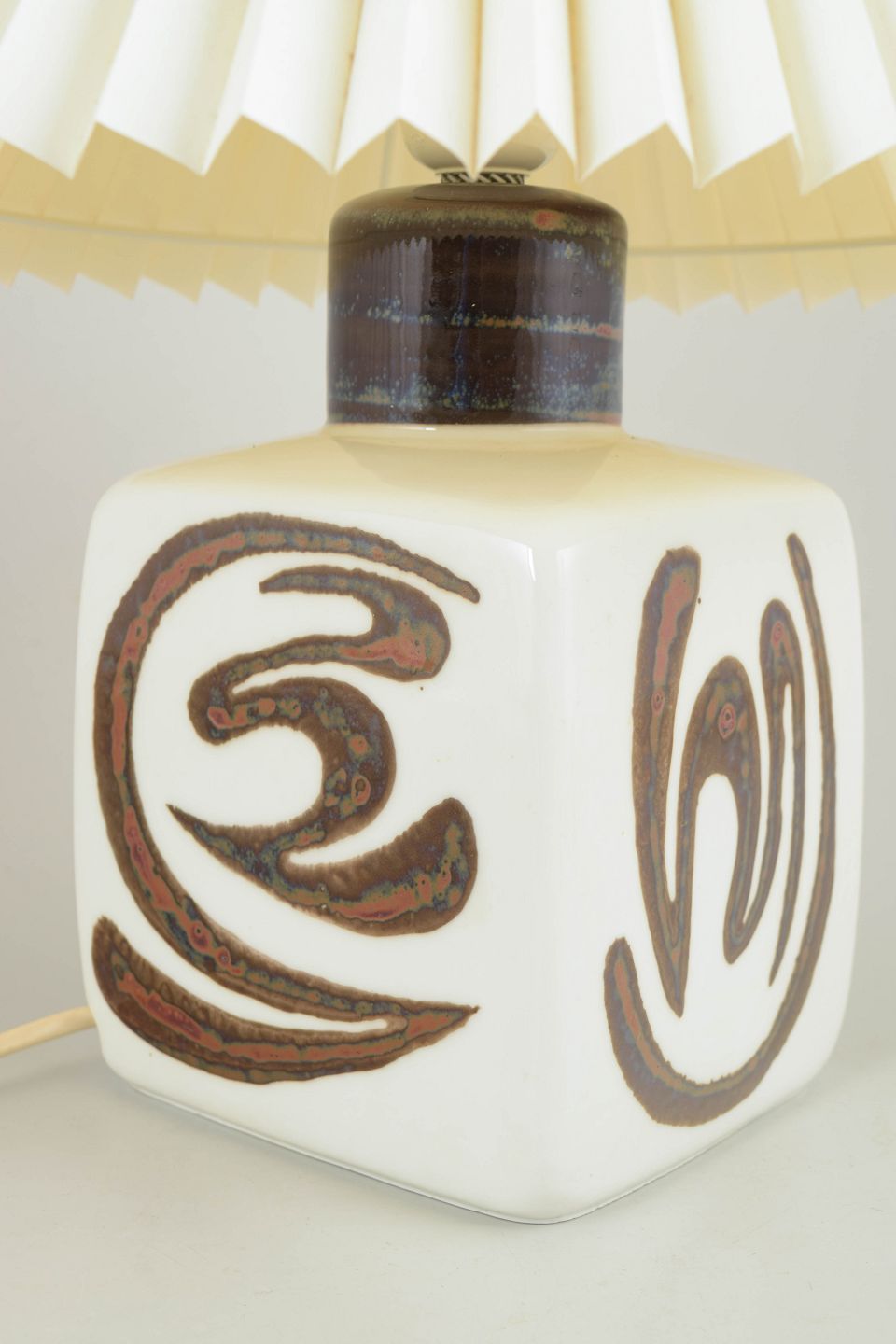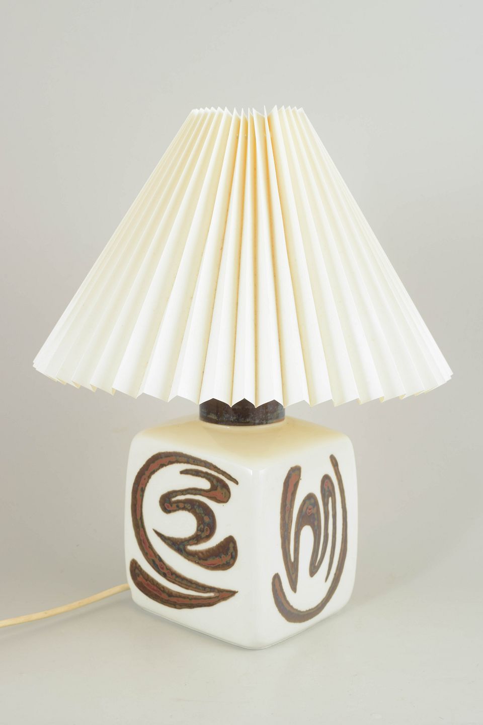 Carl-Harry Stålhane for Rörstrand, “Orient” bordlampe.Keramisk bordlampe i stentøj med hånddekoreret relief i brune og sorte toner på hvid bund. Kvadratisk lampefod med grafisk, orientalsk inspireret ornamentik. Original plisseret Le Klint skærm. Et markant eksempel på svensk modernisme og dansk design fra 1960’erne.