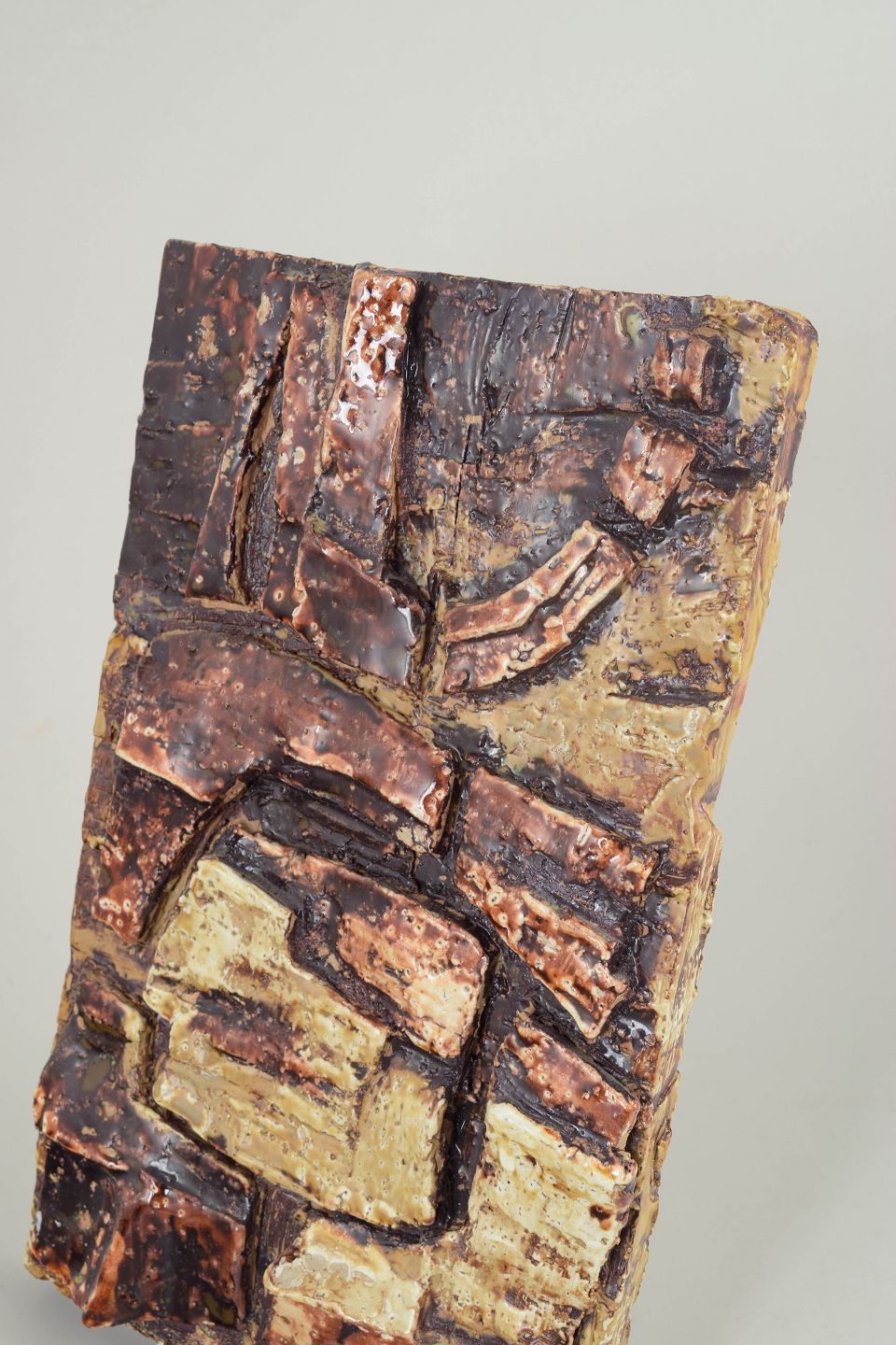 Dorothy Ruhne-Sempinski, vægrelief.Abstrakt, brutalistisk vægrelief i stentøj med kraftig, struktureret overflade og reliefornamentik. Naturlige jordfarver i creme, okker og brune nuancer. Unikt, håndlavet værk, signeret.