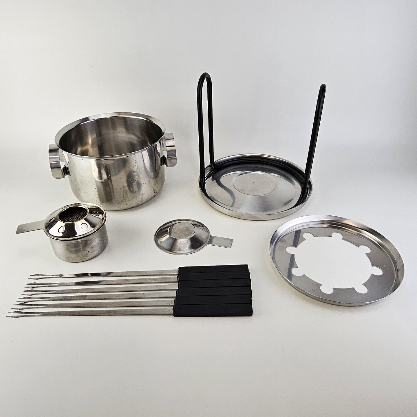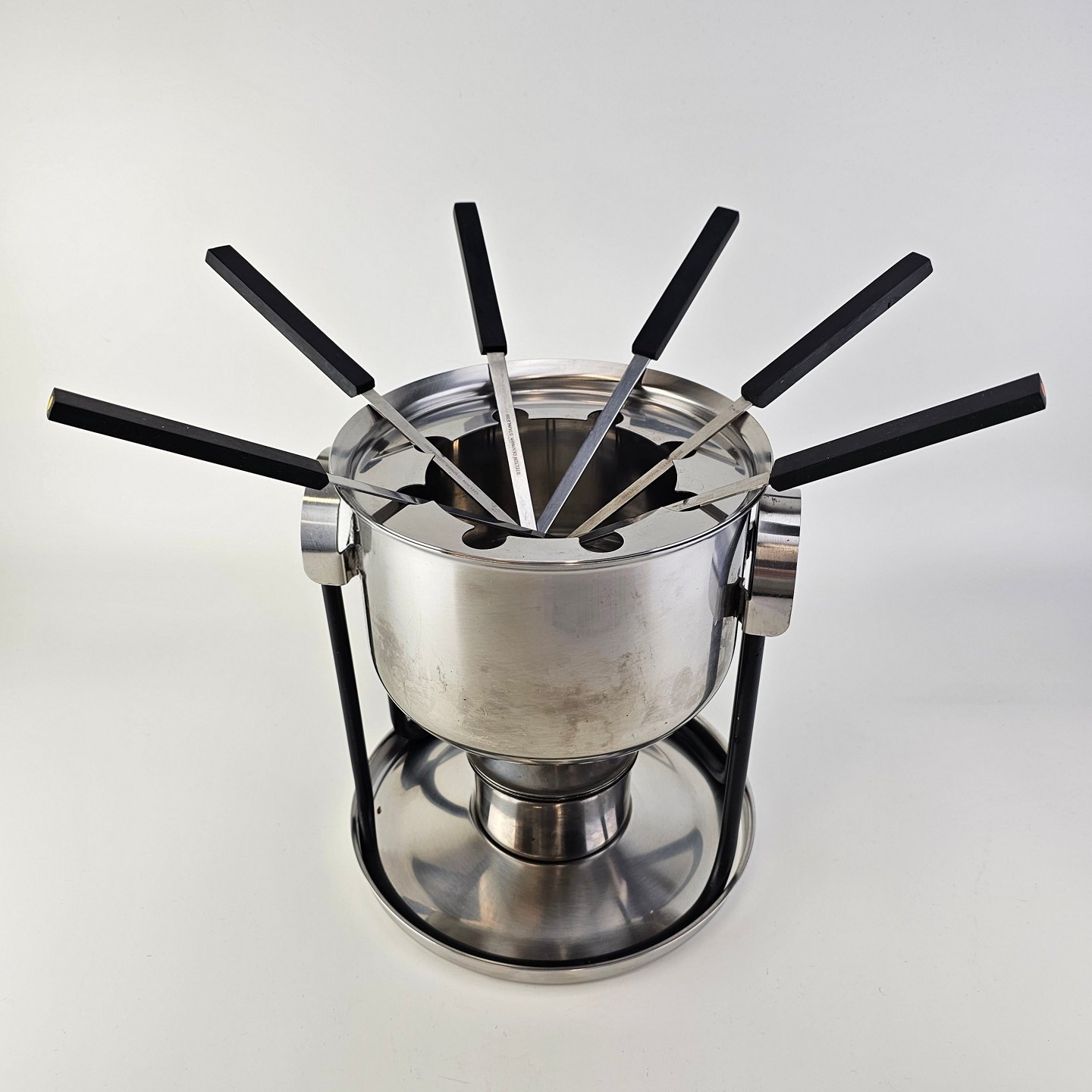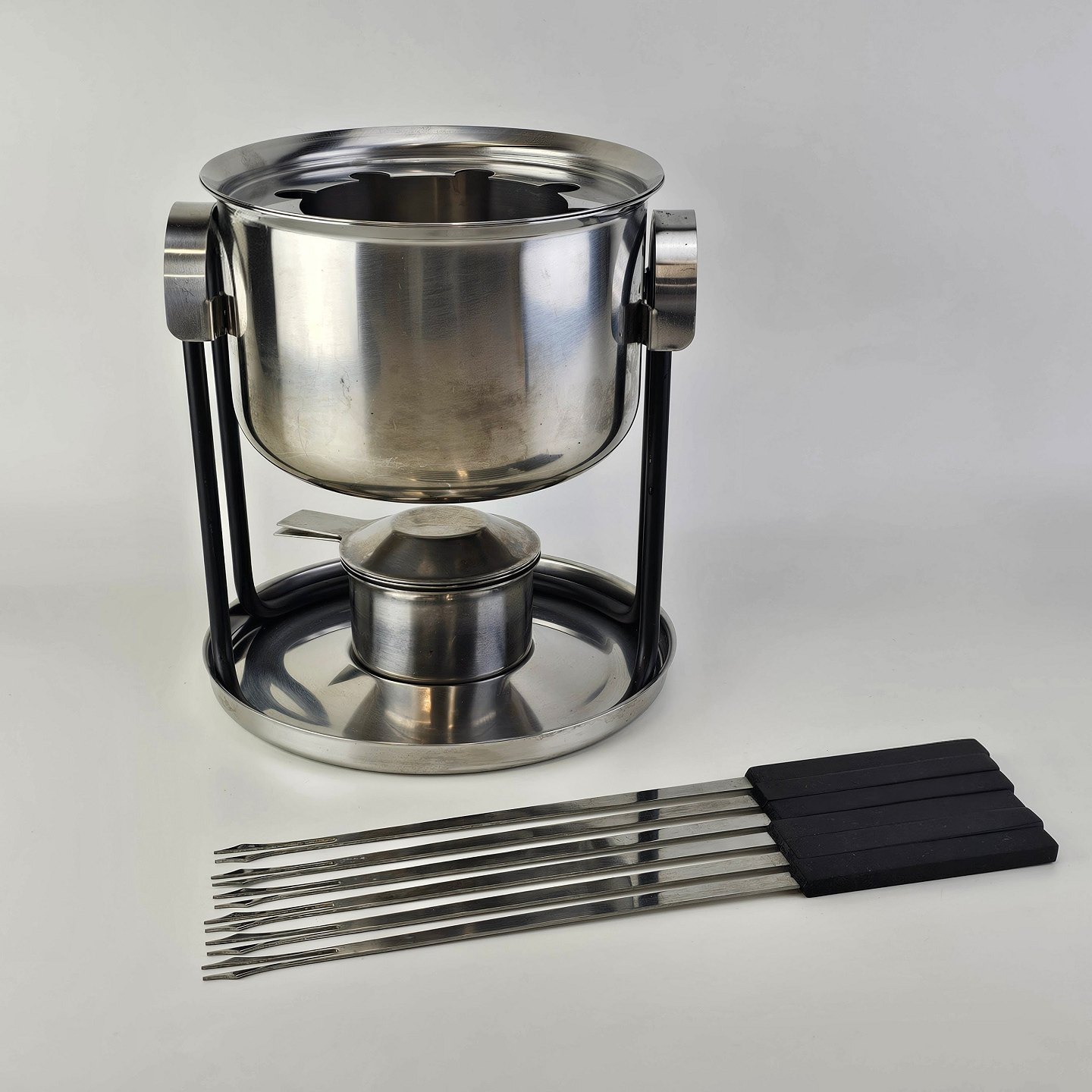 Stelton fonduesæt i rustfrit stål inklusiv stander, brænder, gryde og seks fondue gaflerProducent Stelton