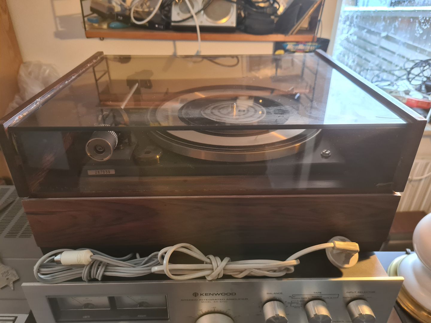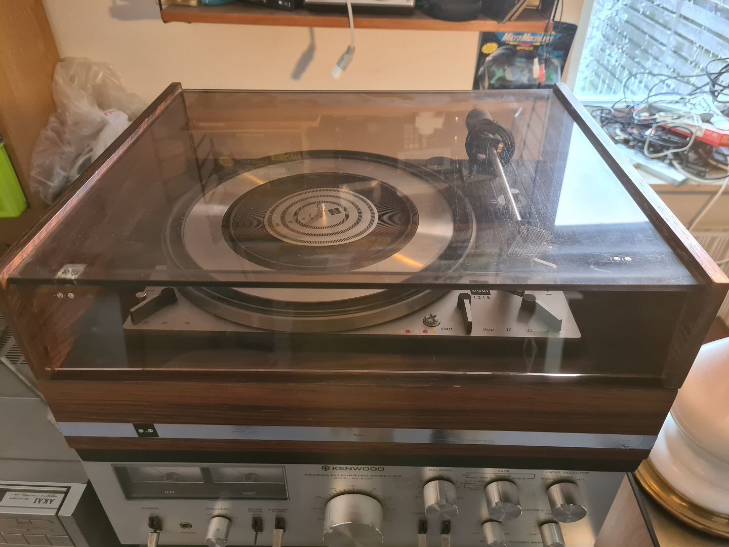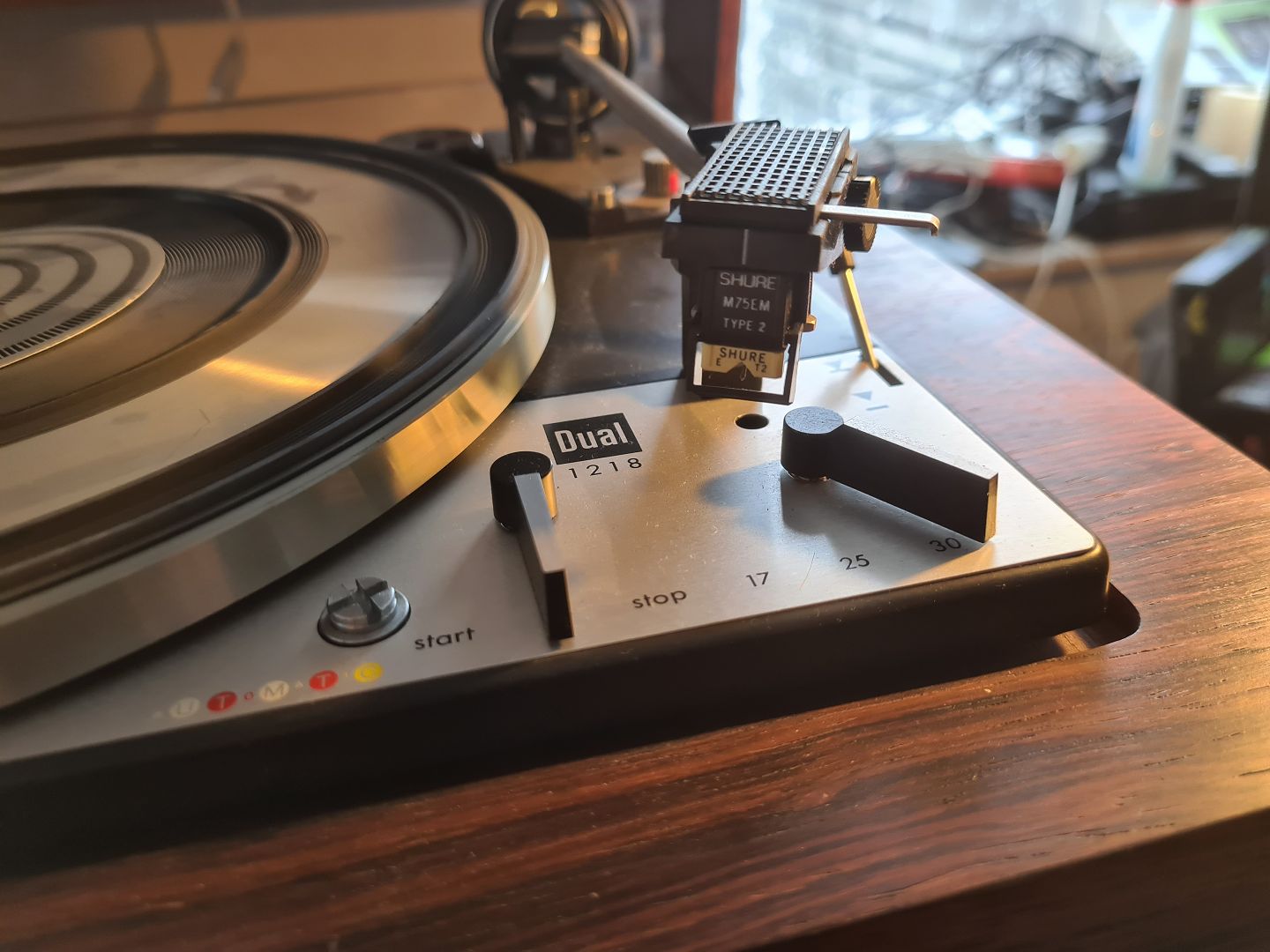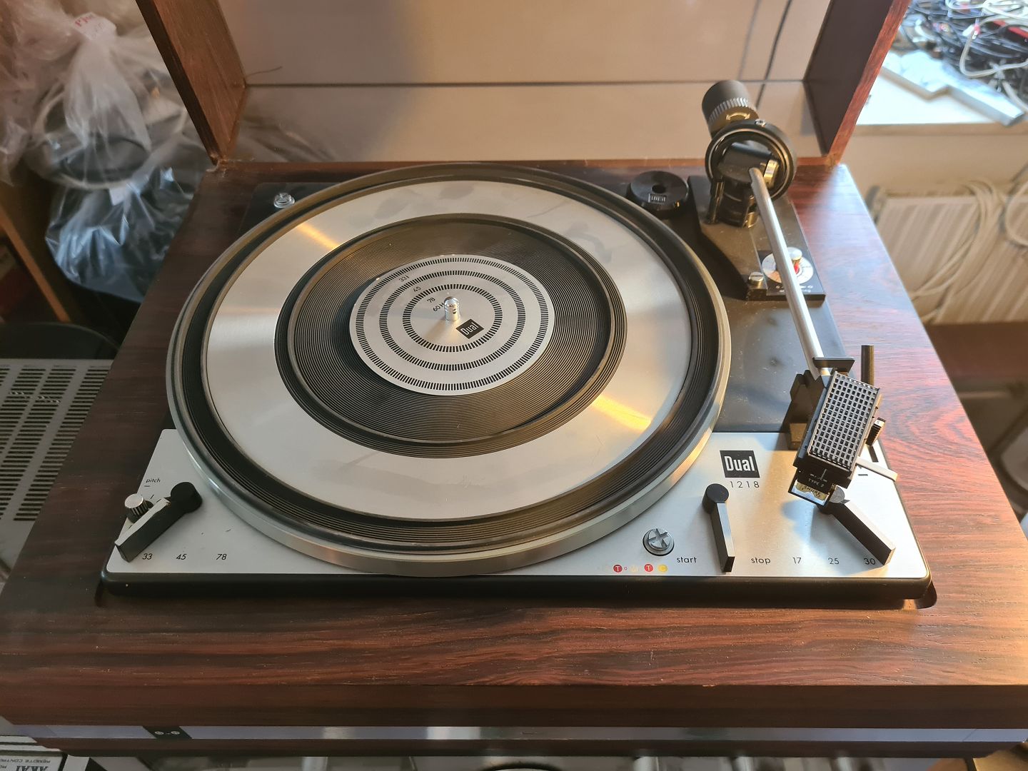 Pladespiller fra Dual model 1218 fra slut 1960- start 1970'erne. Her i palisander kabinet. Testet og kører som den skal. Fremstår original kun med lettere brugsspor. Tonearm monteret med Shure pick-up model M75EM Type 2.Højde 18 cm. Bredde 42 cm. Dybde 35,5 cm.
