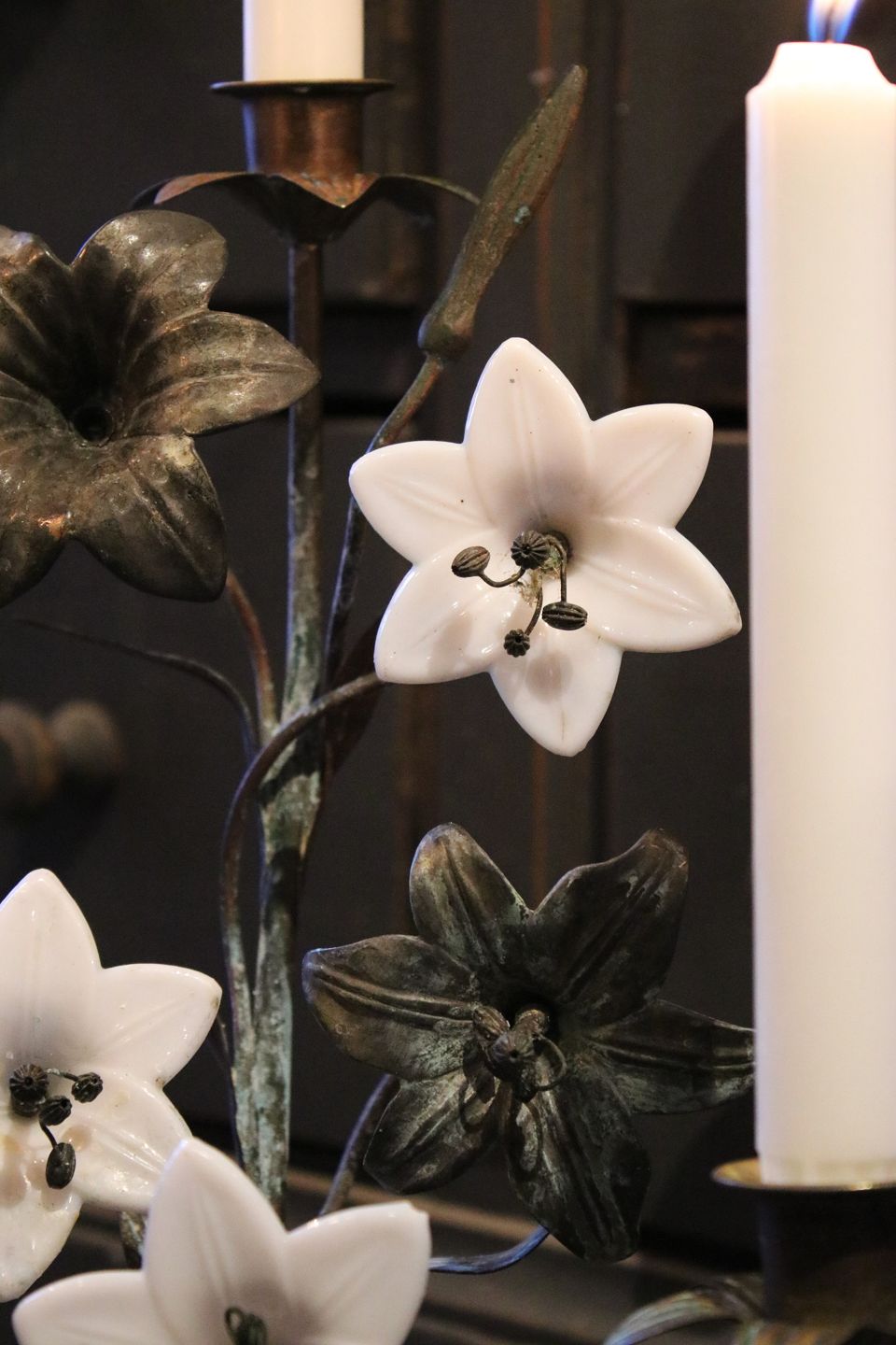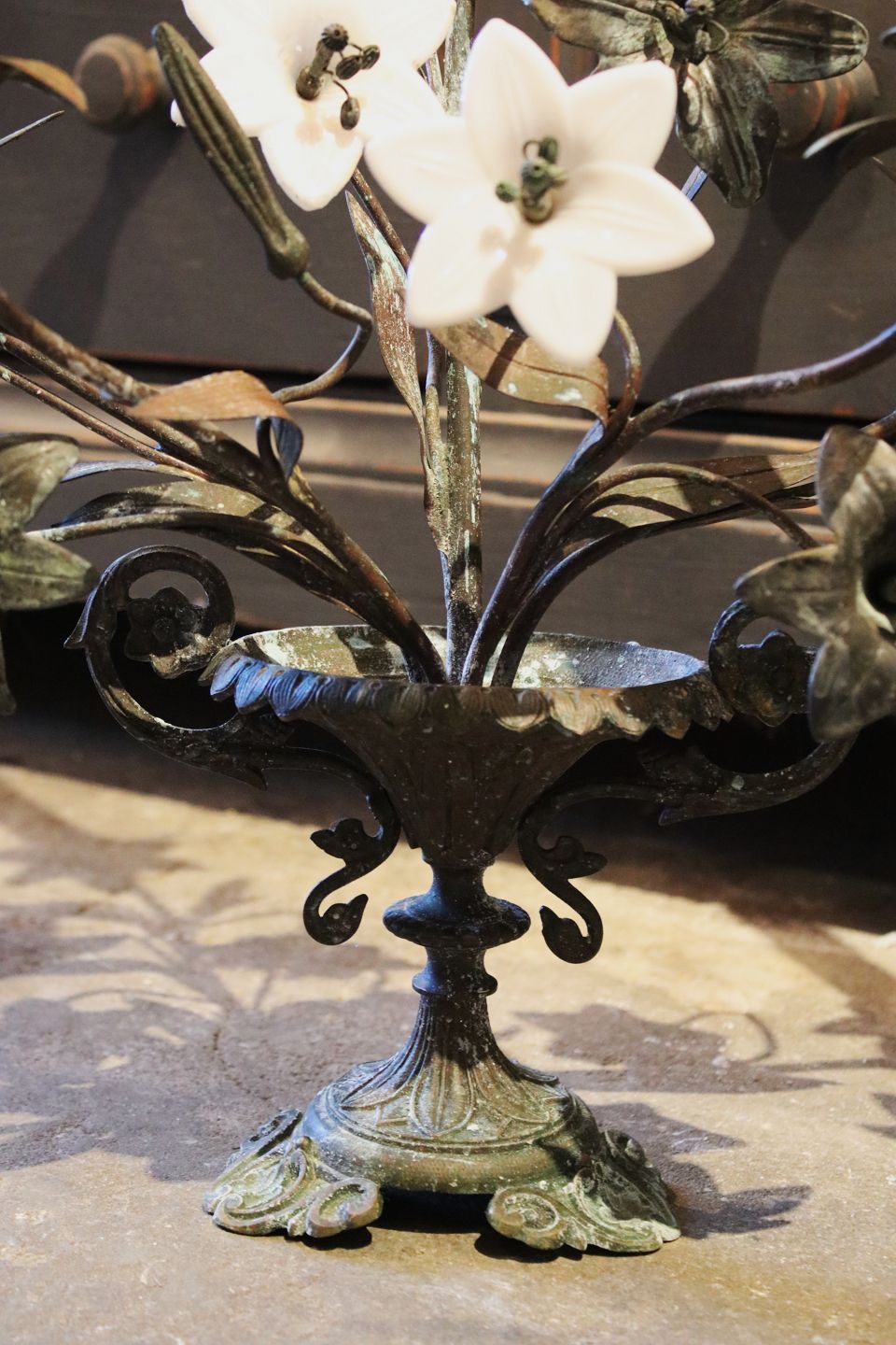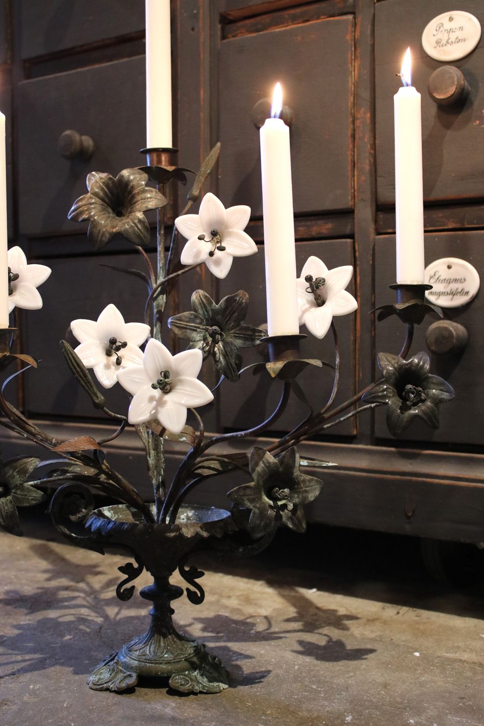 Antik fransk kirkestage i helt mørk patina , dekoreret med blandt andet 5 gamle hvide opal glas blomster og fin vase formet fod.Lysestagen har plads til 5 stearinlys.