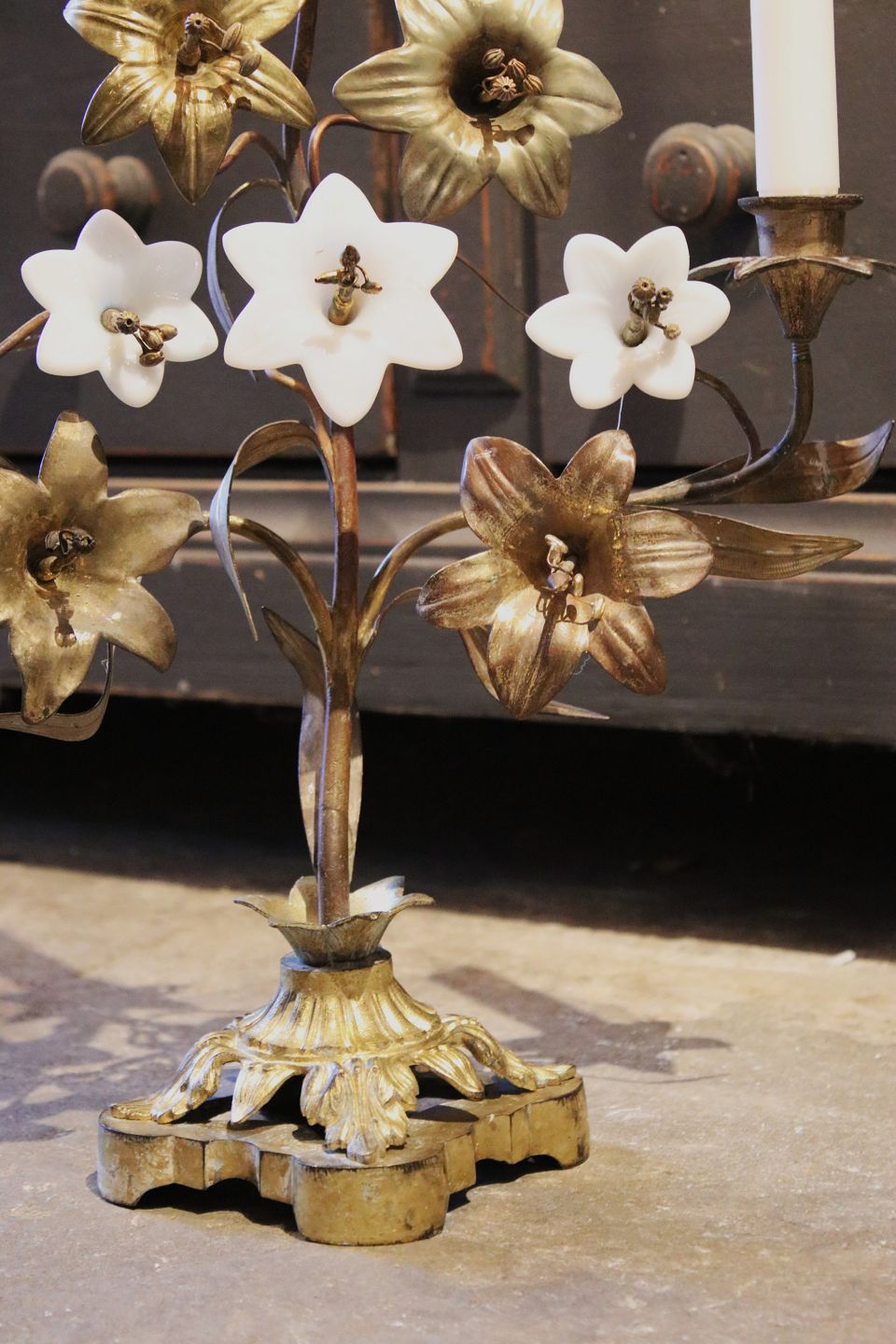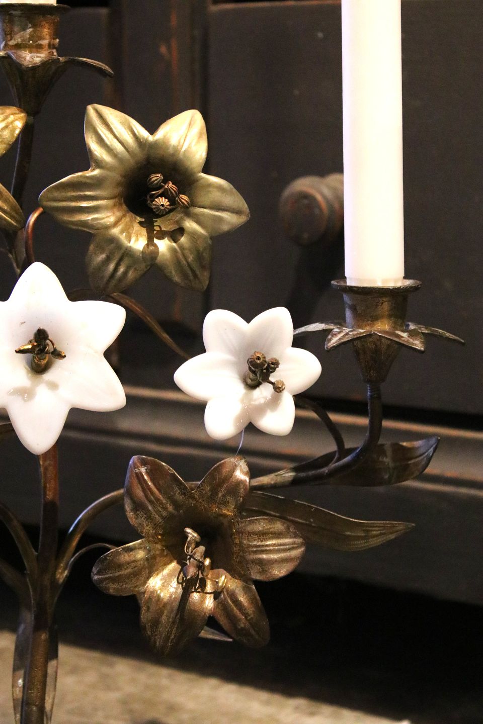 Gammel fransk kirkelysestage i bronze , dekoreret med bronze liljer og 3 gamle hvide opaline glas liljer.Lysestagen har plads til 3 stearinlys og måler H: 38,5cm. B: 34cm.