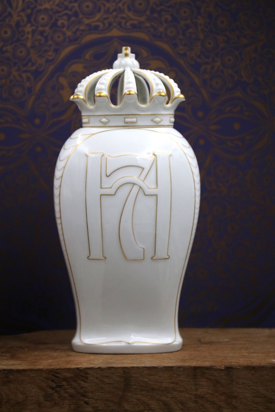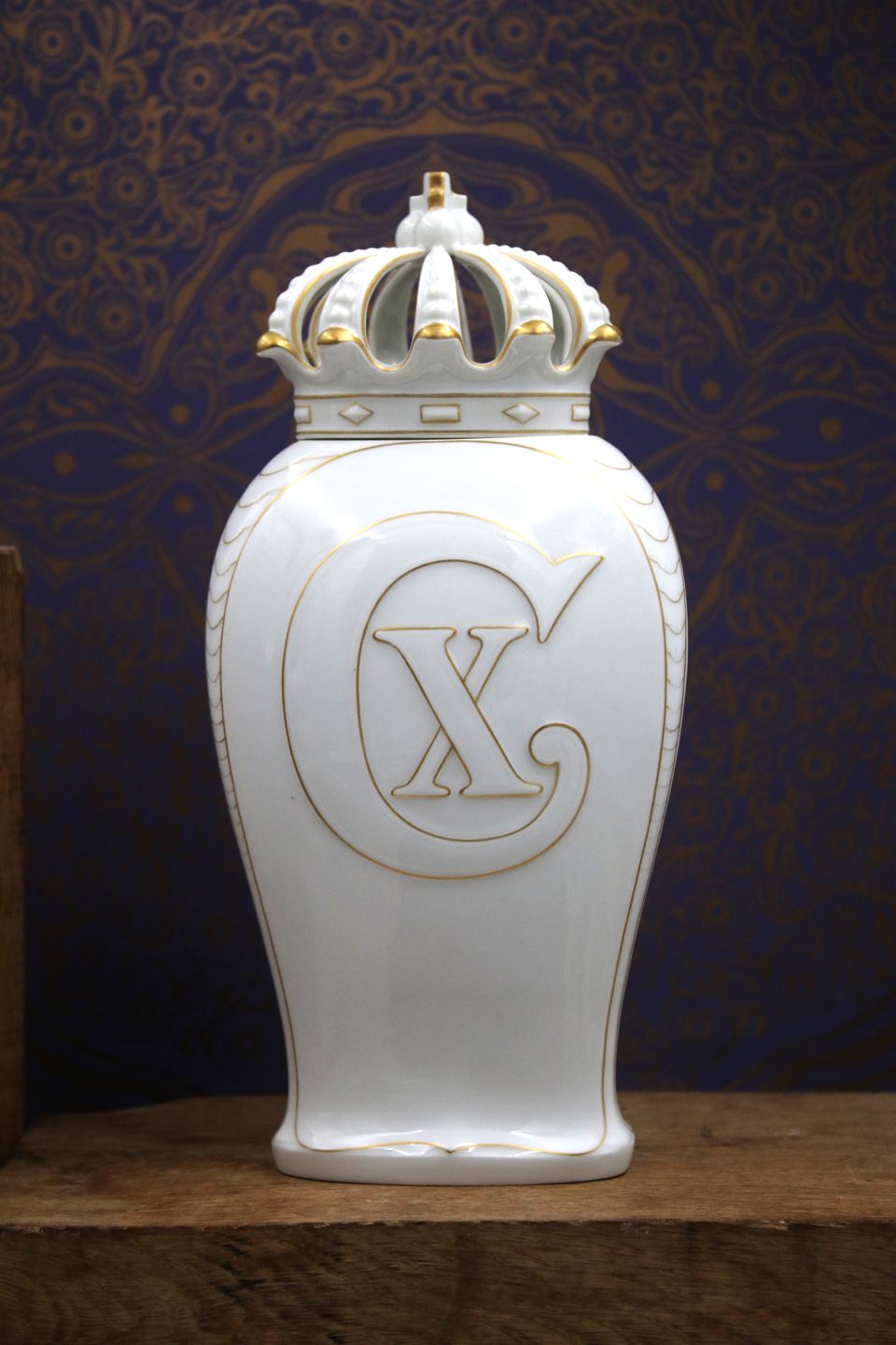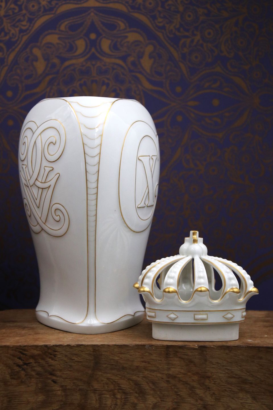 Gammel Bing & Grøndahl vase / lågkrukke i hvid porcelæn med kongekrone på toppen , guld dekorationerog Kong Christian d.X´s monogram. Højde: 24cm.