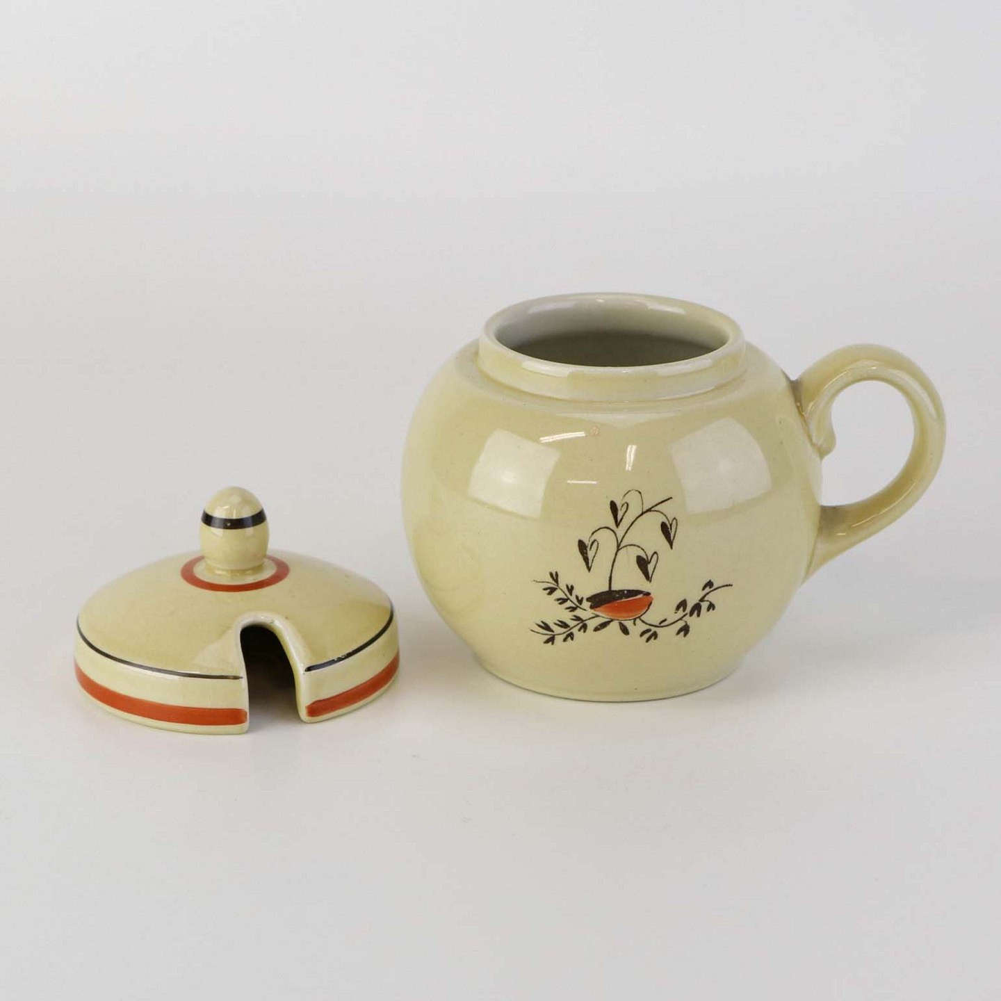Kop med låg og hank til sennep i fajance fra stellet Silkeborg fremstillet i perioden 1937-1939. Nr. 1765Formgiver Thorkild Olsen