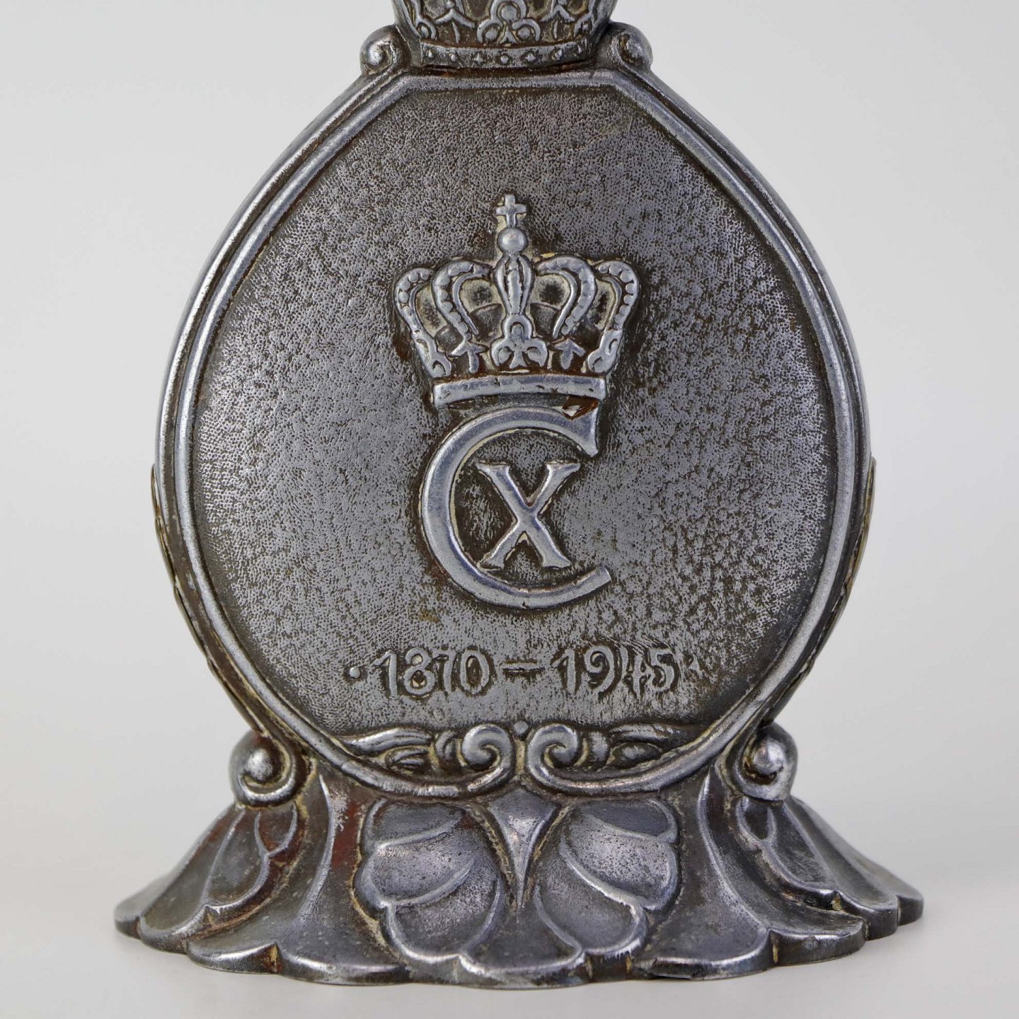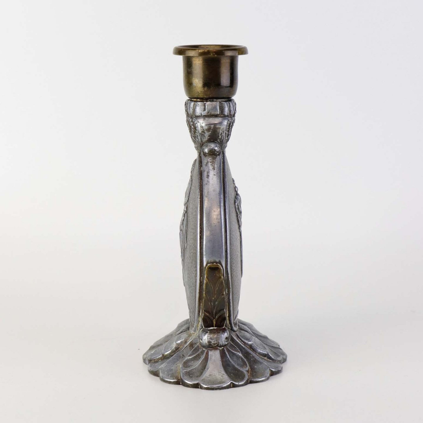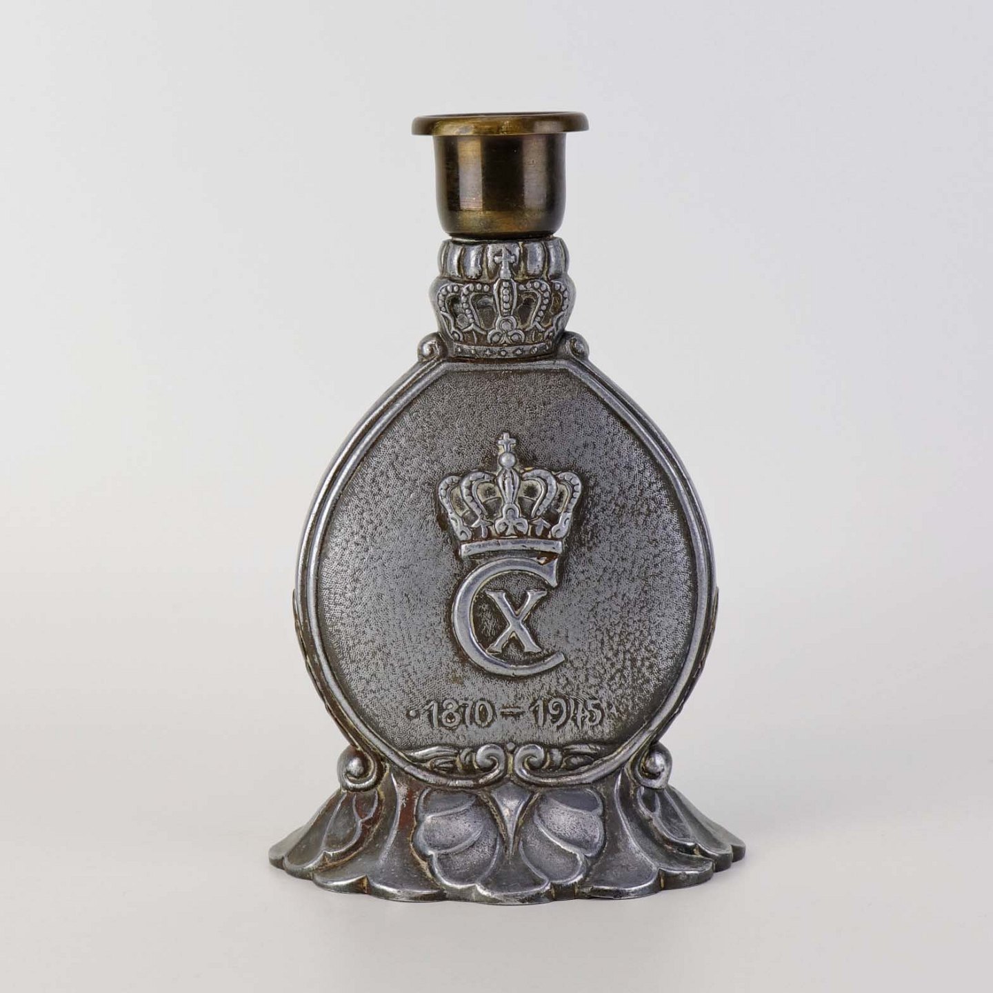 Lysestage i tin med messing dekoration og top med motiv af Kong Christian den 10. til hest med teksten 'Der rider en konge' og '1870-1945'Mærket CJ under bunden.