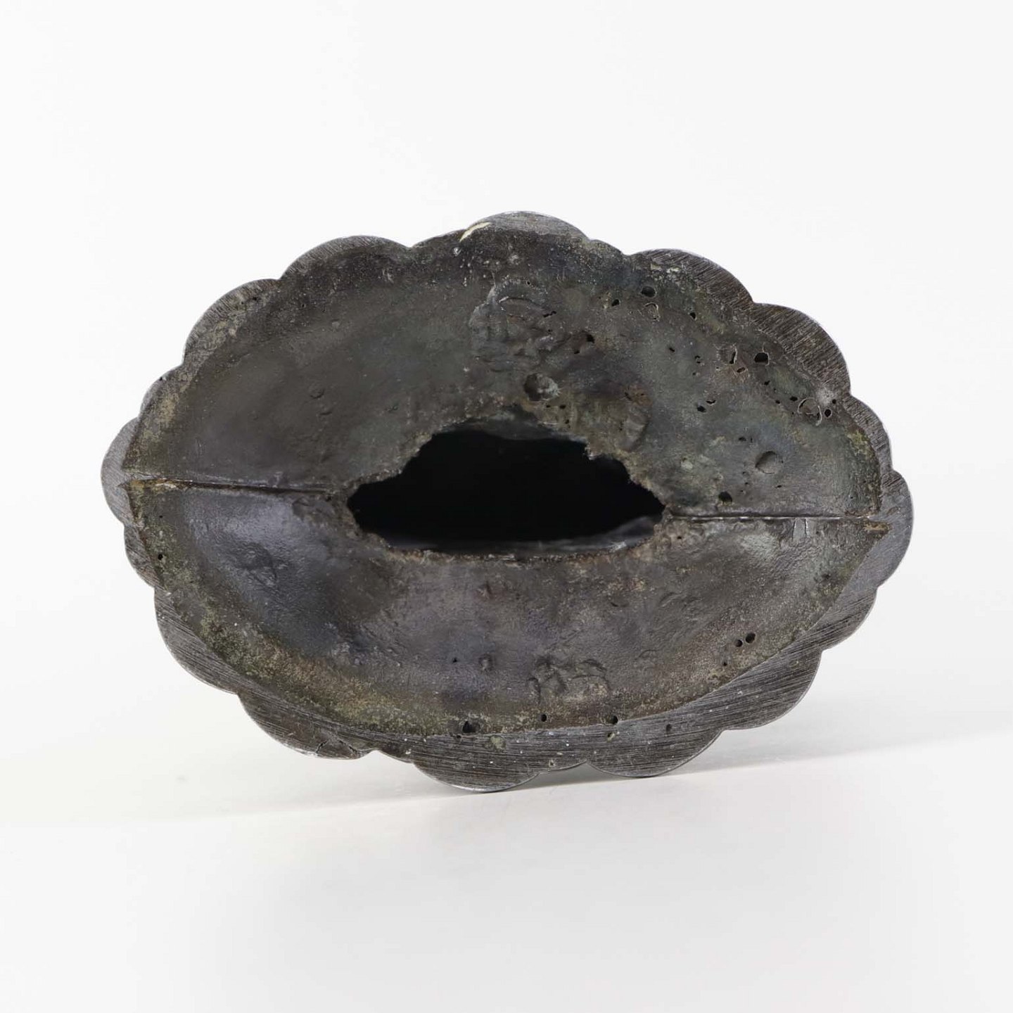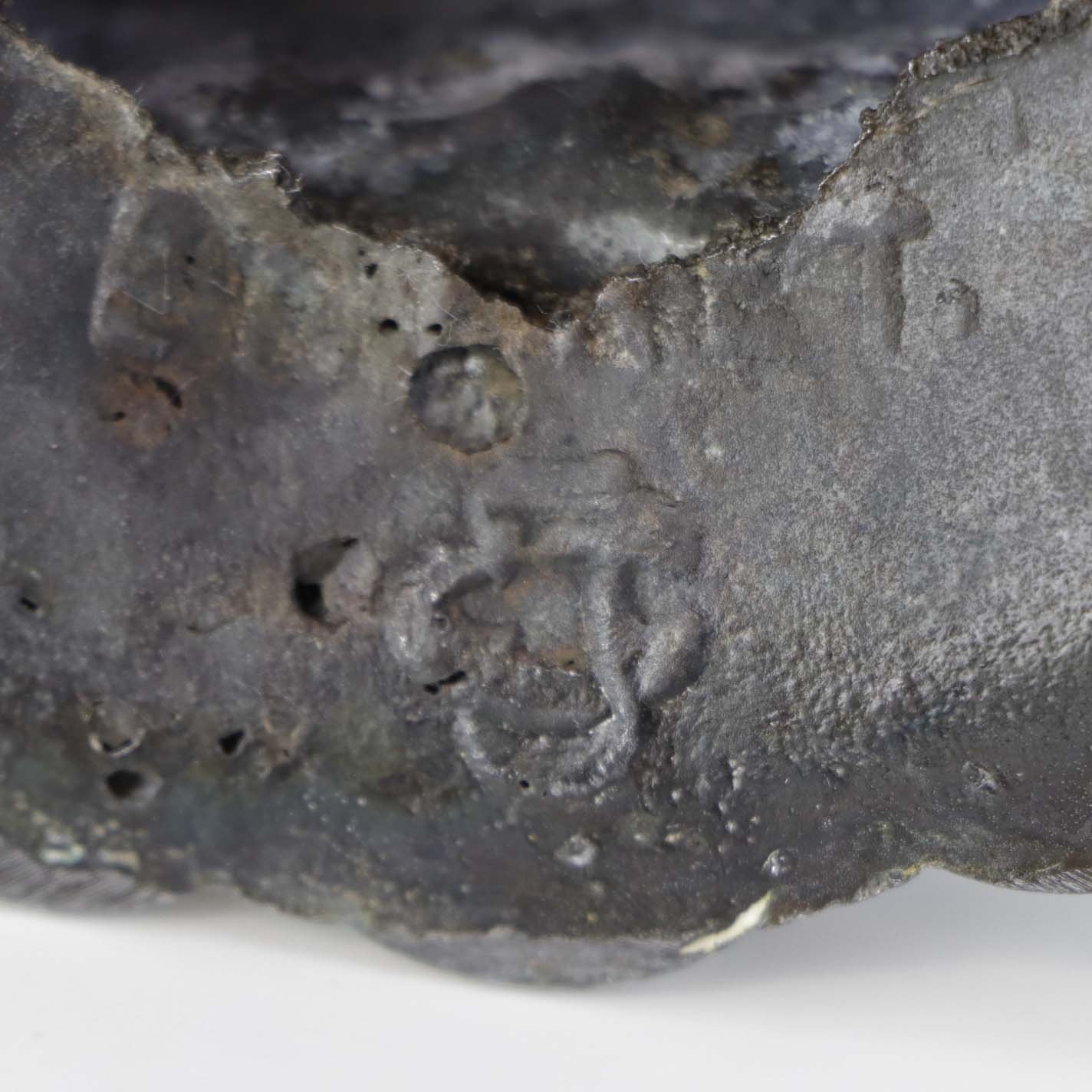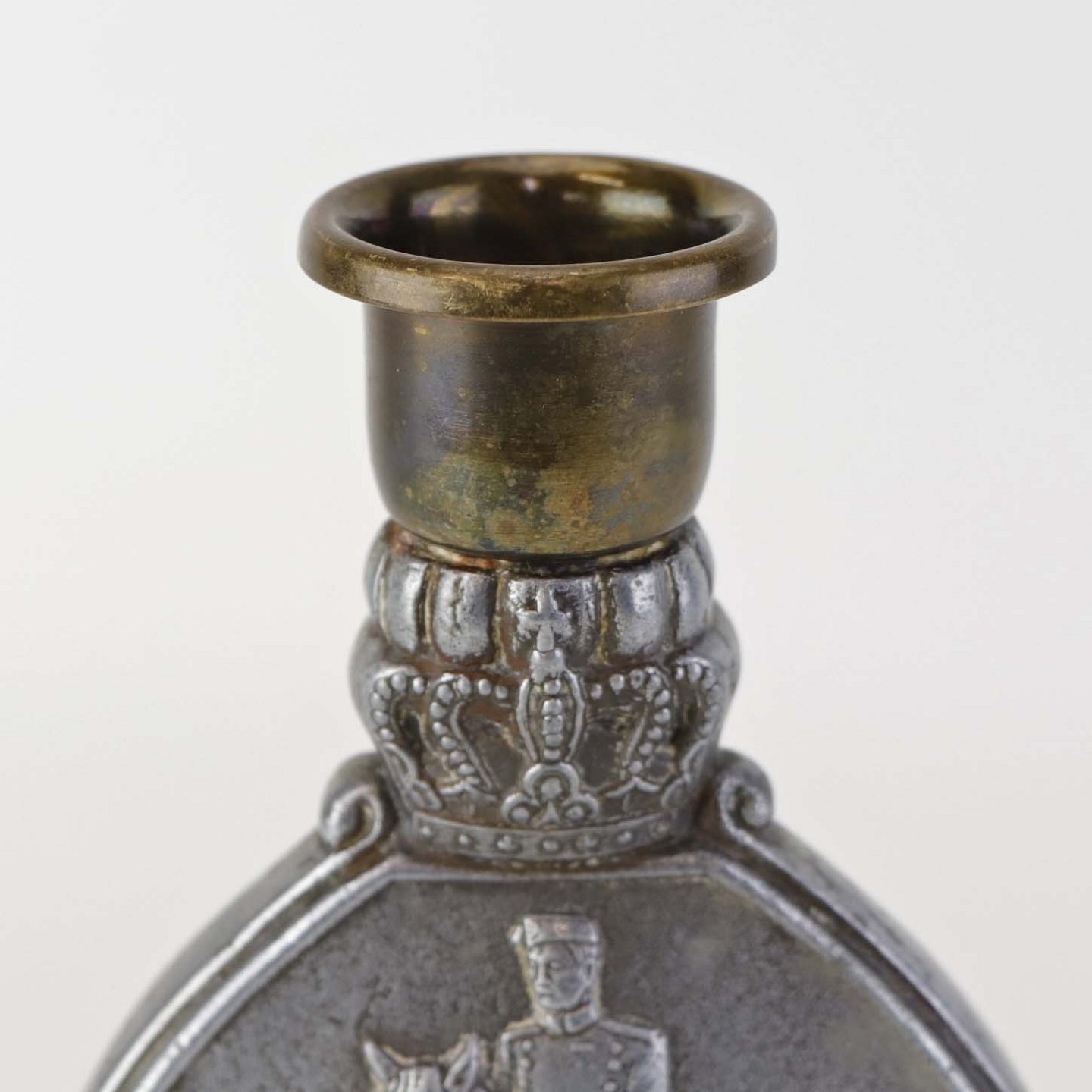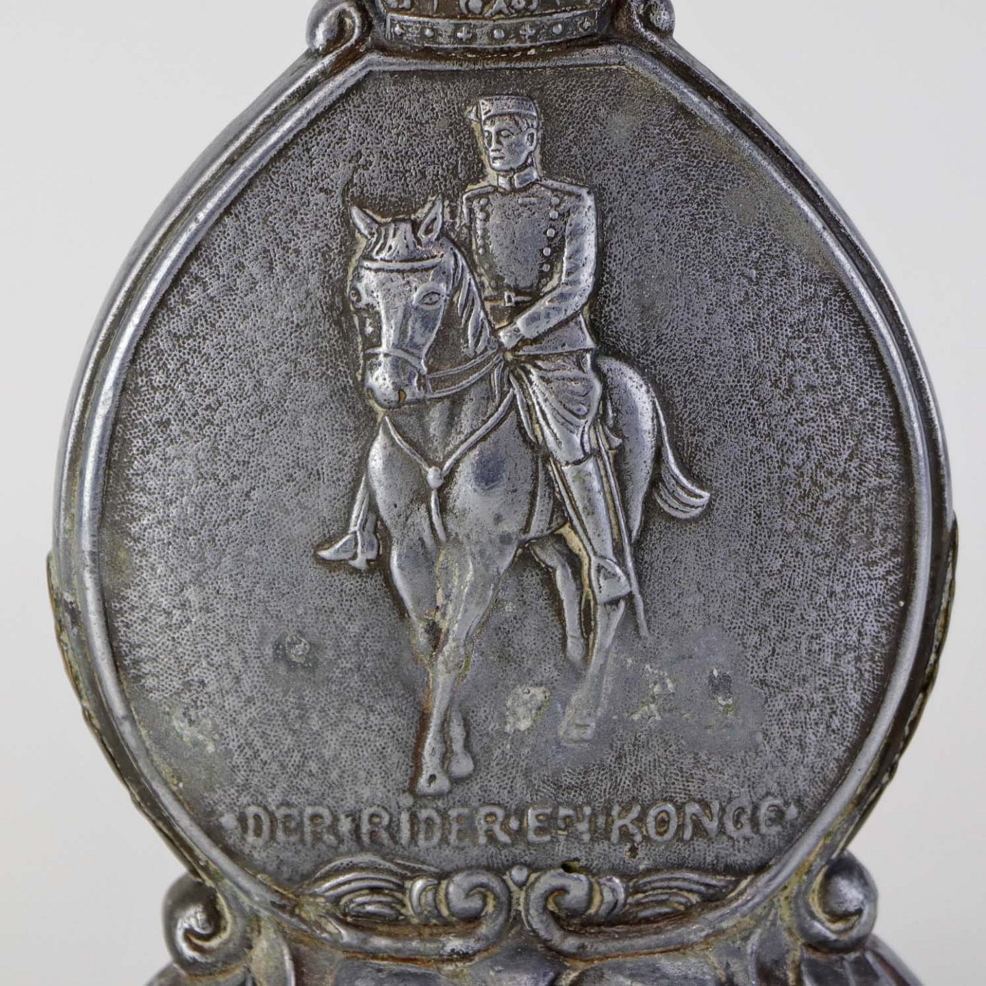 Lysestage i tin med messing dekoration og top med motiv af Kong Christian den 10. til hest med teksten 'Der rider en konge' og '1870-1945'Mærket CJ under bunden.