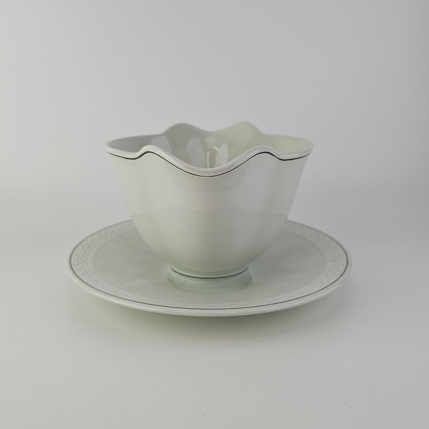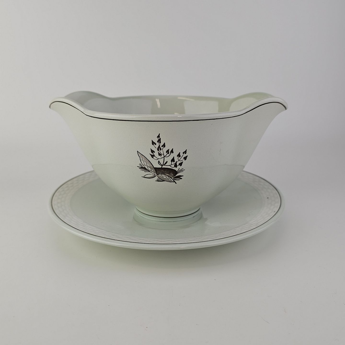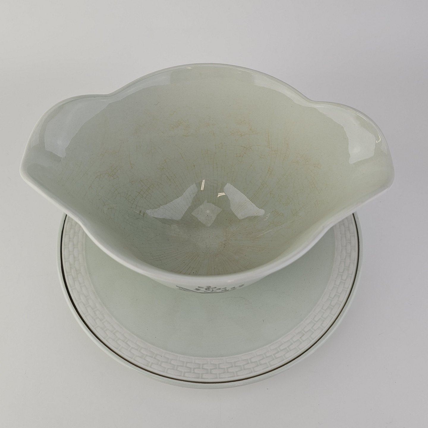 Stel i lysegrøn fajance med natur dekoration og flettet kant