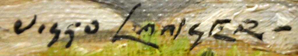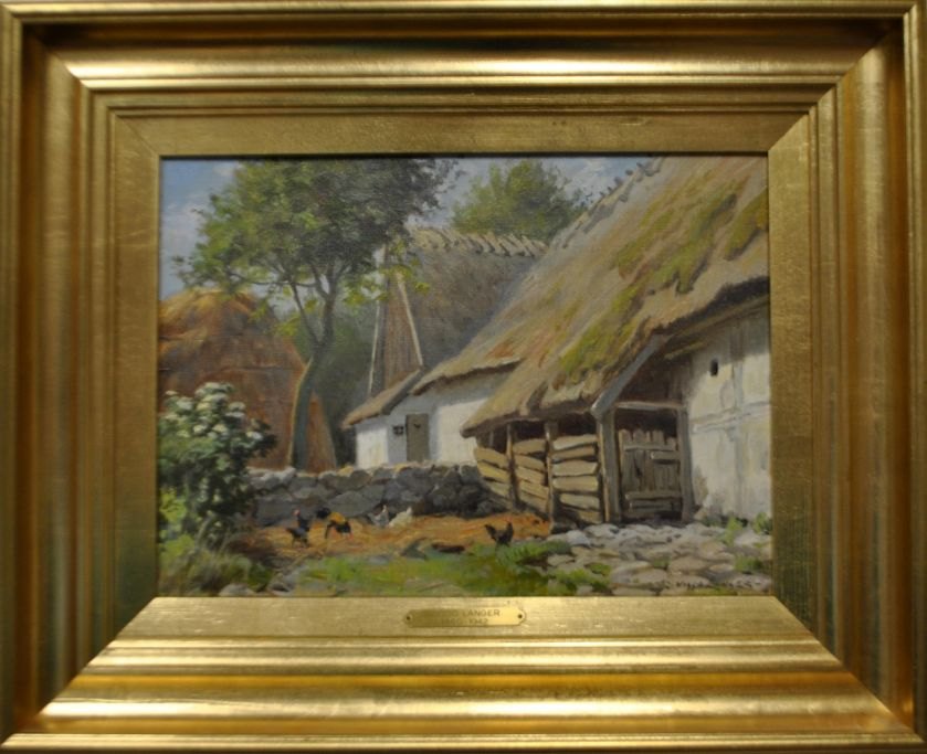 Langer, Viggo (1860 - 1942) Danmark: Høns ved en gård. Olie på lærred. Signeret. 24 x 33 cm.Indrammet: 38 x 47 cm.