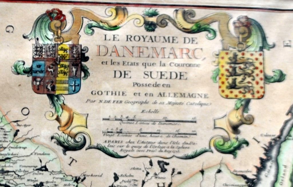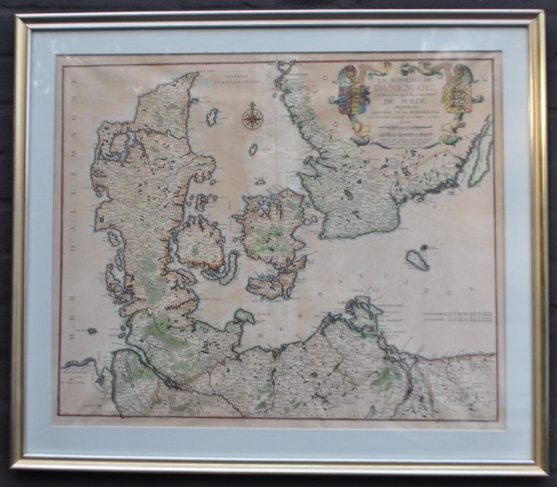 Nicolas de Fèr (1646 - 1720) Frankrig: Generalkort over Danmark. "Le Royaume de Danemare et les Etats que la Conronne de Suède possande en Gothie et en Allemagne. Paris 1713. Håndkoloreret kobberstik. 49 x 59 cm.Indrammet: 61 x 71 cm.