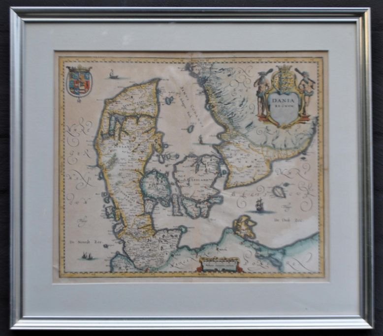 Willem Janszoon Blau (1571 - 1638) Holland: Generalkort over Danmark. 1634. Kobberstik, håndkoloreret. Usignert. 28 x 33 cm.Indrammet: 40 x 45,5 cm.