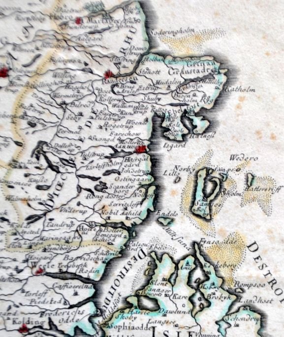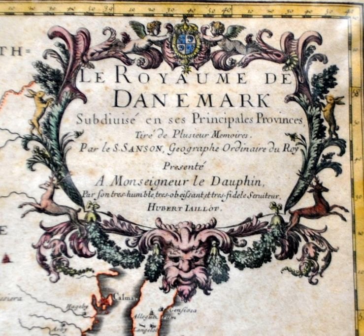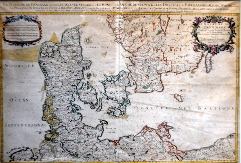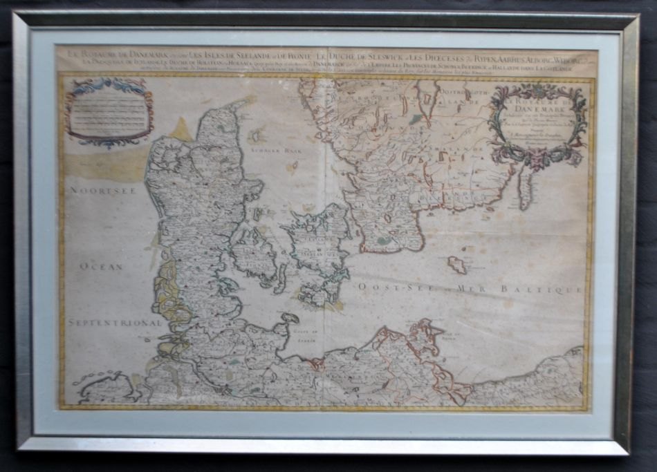 Alexis Hubert Jaillot (1632 - 1712) Frankrig: Generalkort "Le Royaume de Danemark". 1674.Håndkoloreret kobberstik. Med trykt navn. 60 x 84 cm.