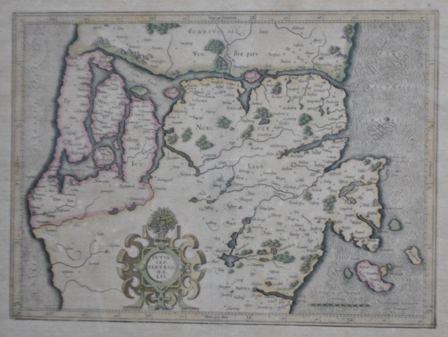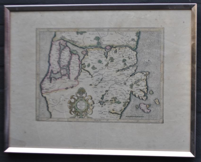Mercator, Gerardus (1512 - 1594) Tyskland/Flandern: Specialkort over Midtjylland. Håndkoloreret kobberstik. Signeret i trykket. Udgivet 1595. Her: Fransk udgave fra 1607 eller 1609. 29 x 41 cm.Indrammet: 46 x 60cm.