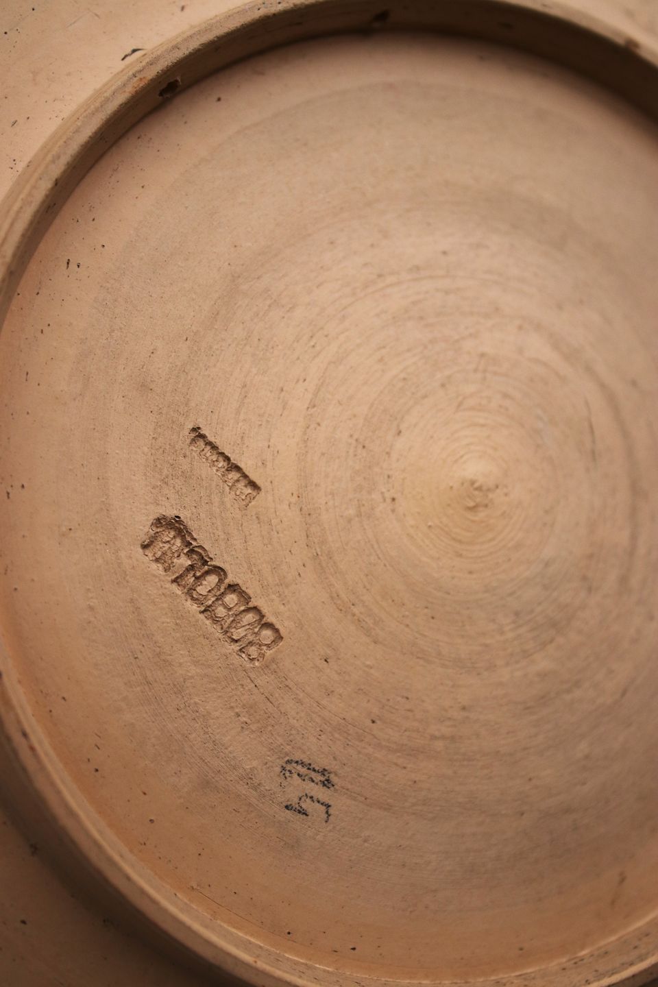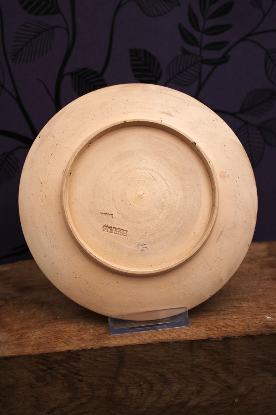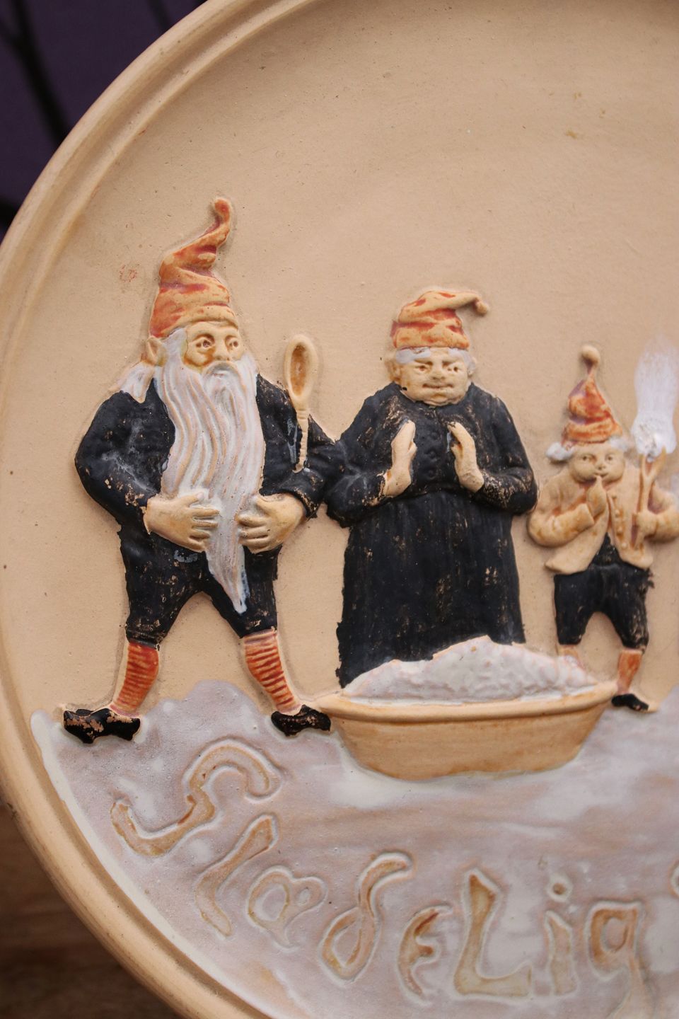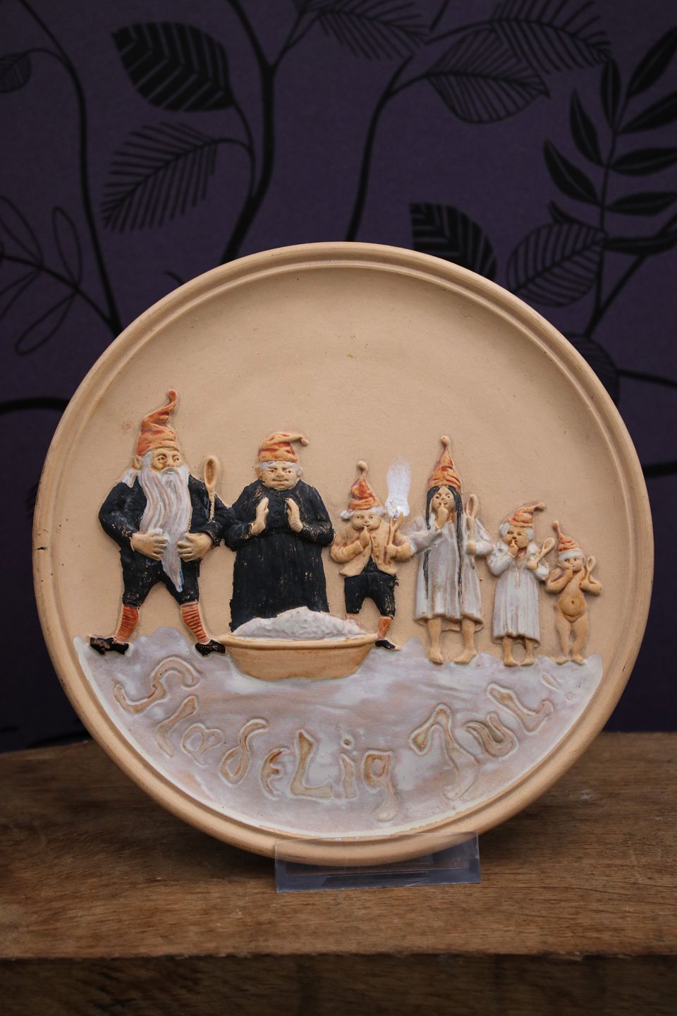 Gammel Jule platte i terrakotta med motiv af nisse familie samlet om risengråden og Glædelig jul skrevet forneden. Dia.: 18,5cm. Udstiller