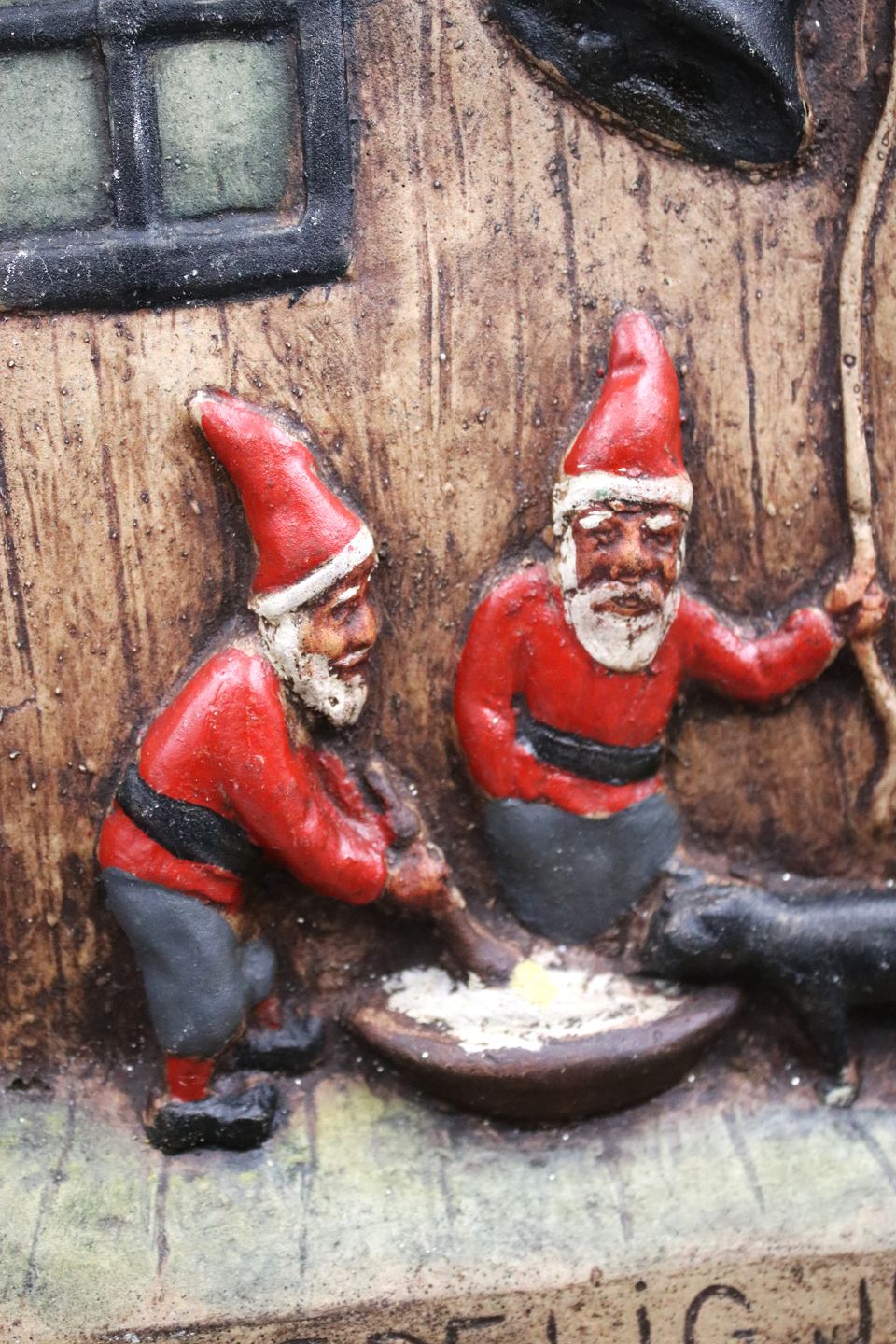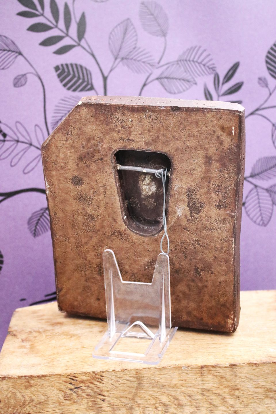 Dekorativ , gammel juledekoration / væg platte i lertøj / terrakotta med julemotiv af 2 julenisser med kat...
