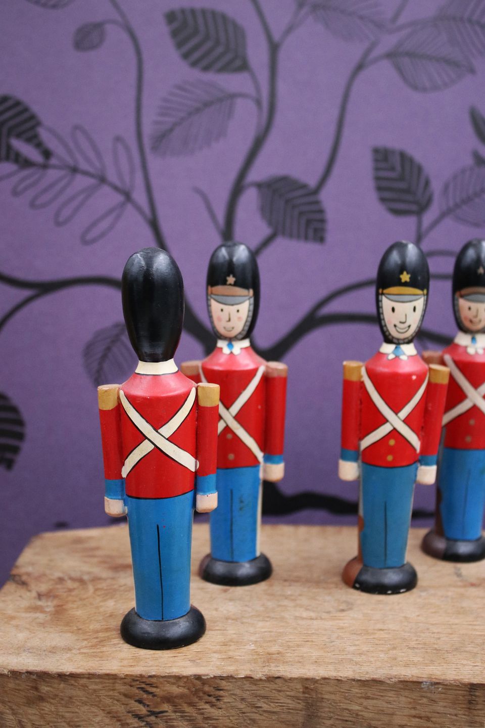 Dekorative , gamle Gardehusarer i fuld uniform i bemalet træ.H: 13,5cm. (4 stk. sælges kun samlet)
