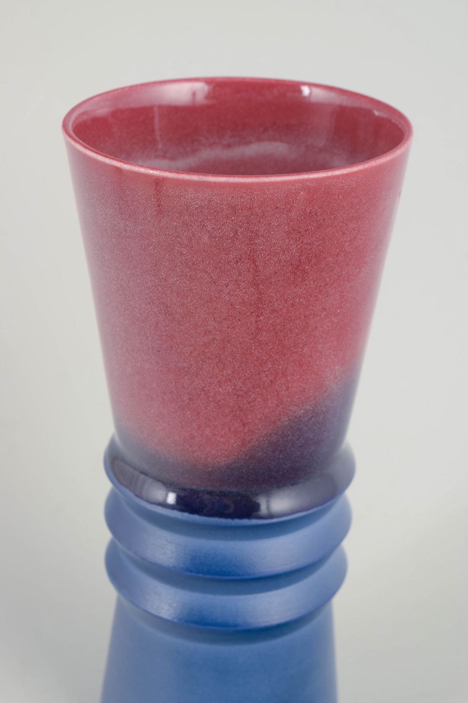 Richard Manz, unika vase.Skulpturelt formet vase i drejet stentøj med markant silhuet. Udført med blank glasur i dybe blå nuancer nederst og rødviolet overgang øverst, typisk for eksperimenterende skandinavisk studiokeramik fra 1960’erne. Det trinvise midterparti giver et arkitektonisk og modernistisk udtryk.