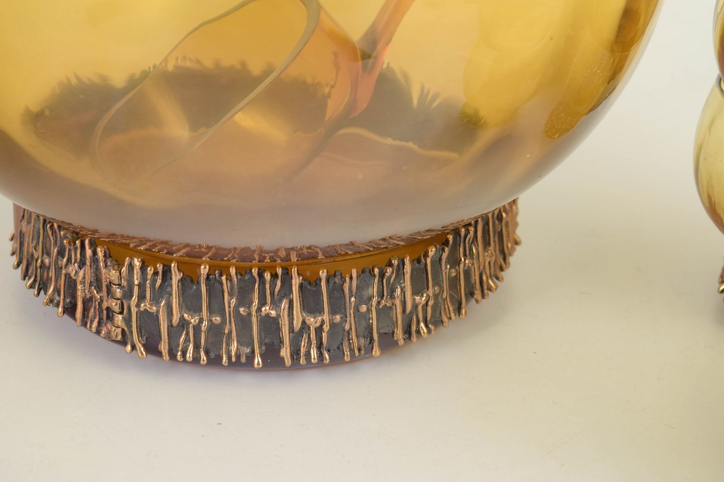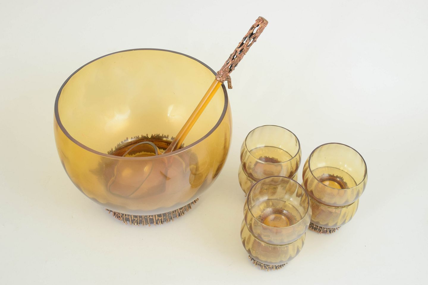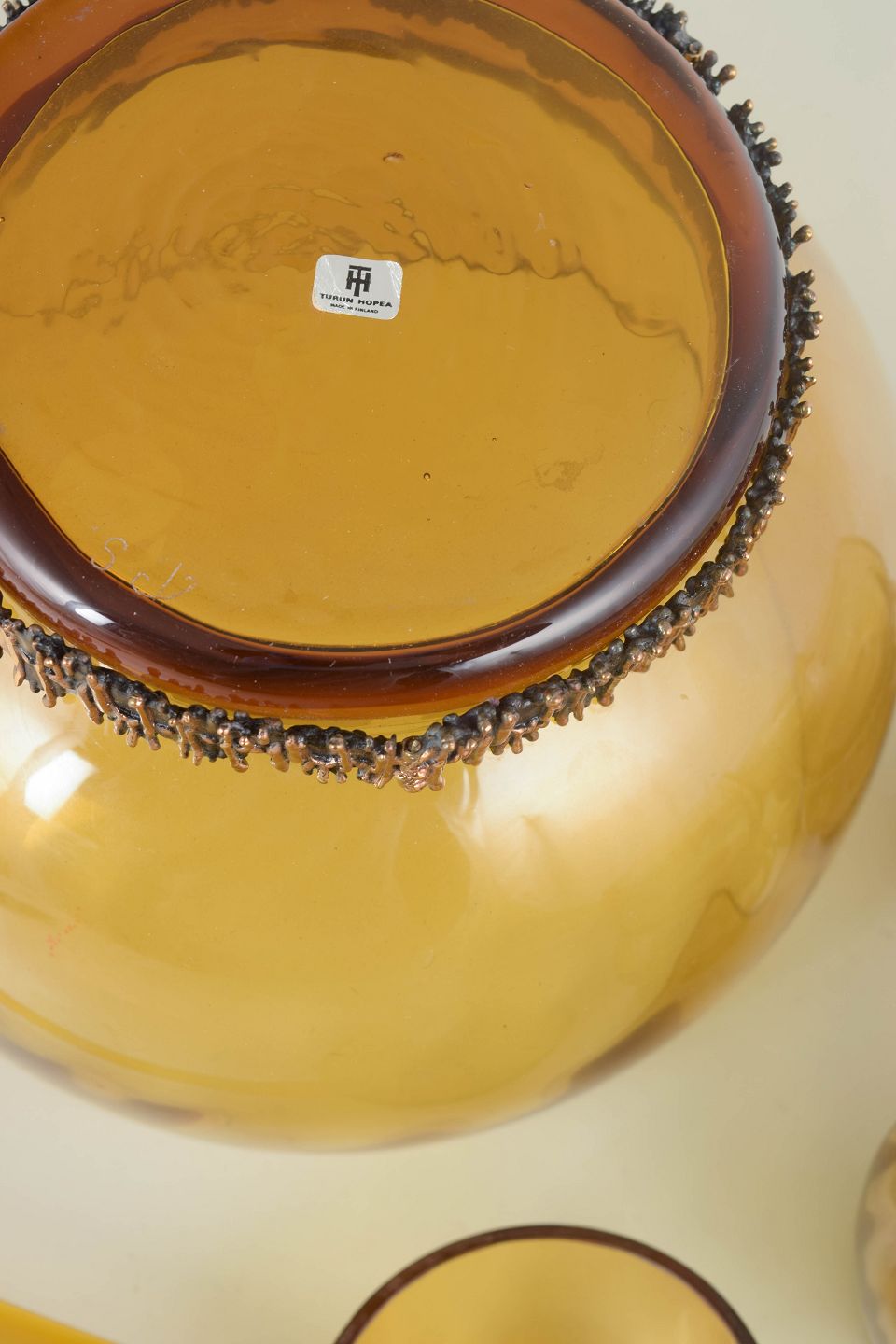 Pentti Sarpaneva for Turun Hopea, punchbowlesæt.Punchbowlesæt i ravfarvet mundblæst kunstglas med karakteristisk metalfod, bestående af stor punchbowle, 6 glas og tilhørende ske. Det skulpturelle design er kendetegnet ved kontrasten mellem det varme glas og den rå, teksturerede metalfod.