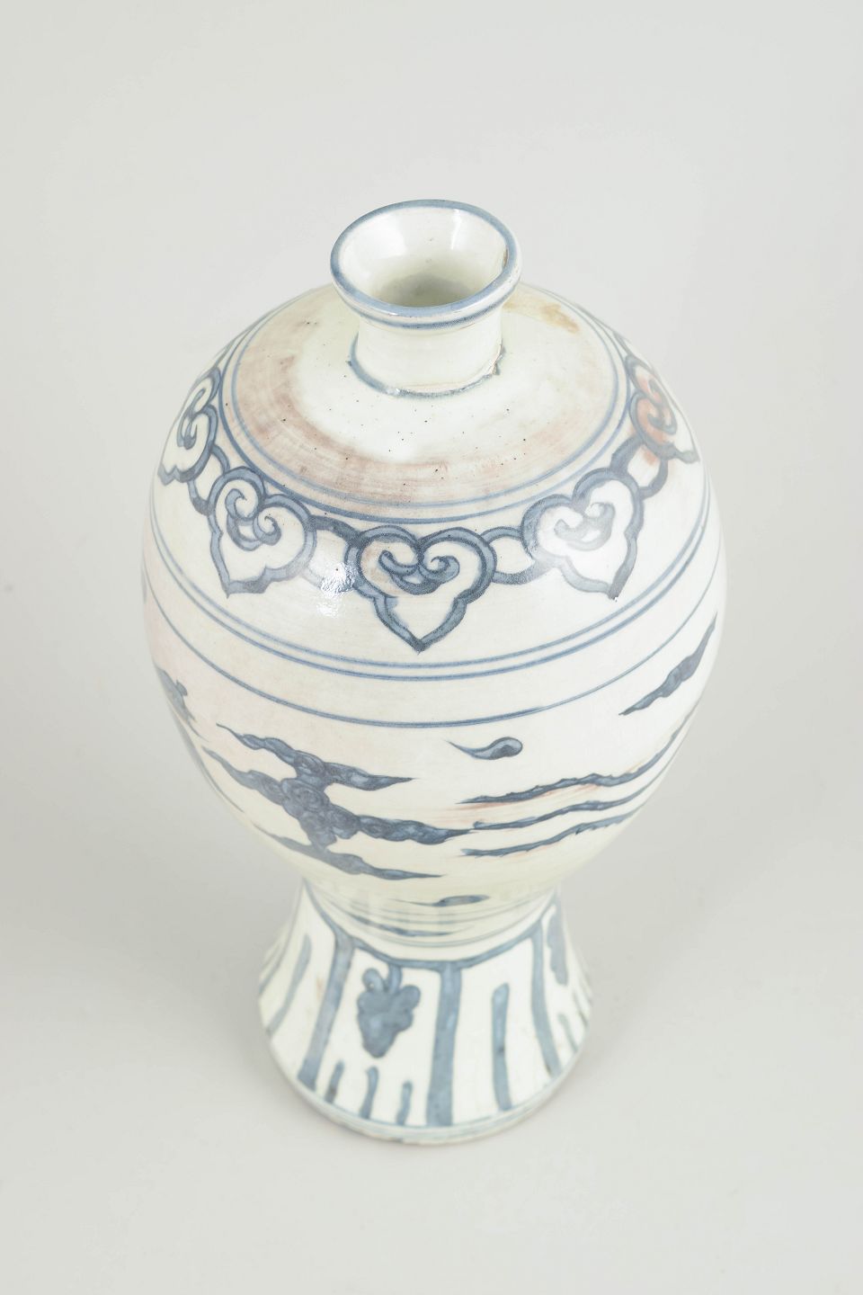 Kina, vase. Sen Ming-dynastiBalusterformet porcelænsvase med indsnævret hals og udsvajet fodring, dekoreret i underglasurblå. Motivet viser en føniks (fenghuang), der flyver blandt stiliserede skyer, et klassisk kinesisk lykkesymbol forbundet med dyd, harmoni og kejserlig symbolik. Skulder og fod er fremhævet med ornamentale borter. Klassisk og velafbalanceret form.