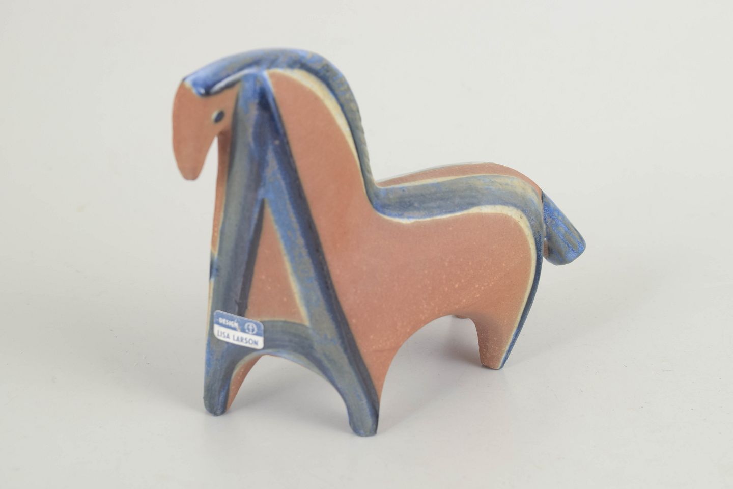 Lisa Larson for Gustavsberg, hestefigur.Stiliseret hest i stentøj med kompakt, arkitektonisk form og bløde, afrundede konturer. Udført med mat, sandfarvet glasur kombineret med dæmpede blå og lyse nuancer, karakteristisk for Lisa Larsons formsprog. Figuren er fra 1970’erne og bærer originalt Gustavsberg-mærke.