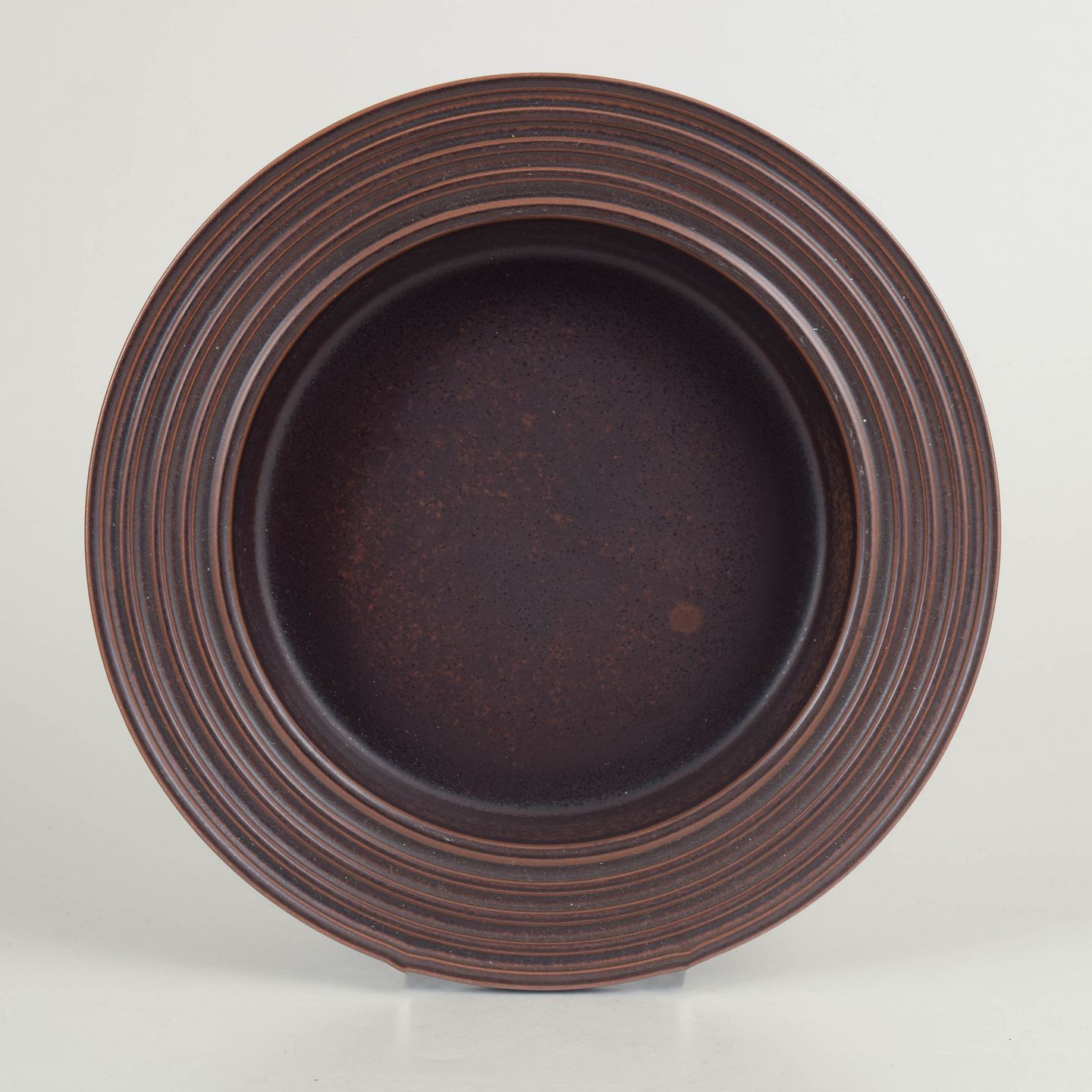 Ulla Procopé for Arabia, Ruska skål.Stor skål i stentøj fra Ruska-serien hos Arabia, udført med karakteristisk, meleret mørkebrun glasur i varme jordtoner. Åben, rund form med bred, profileret fane og dyb kumme, velegnet til servering. Glasuren varierer naturligt og giver skålen et individuelt udtryk.