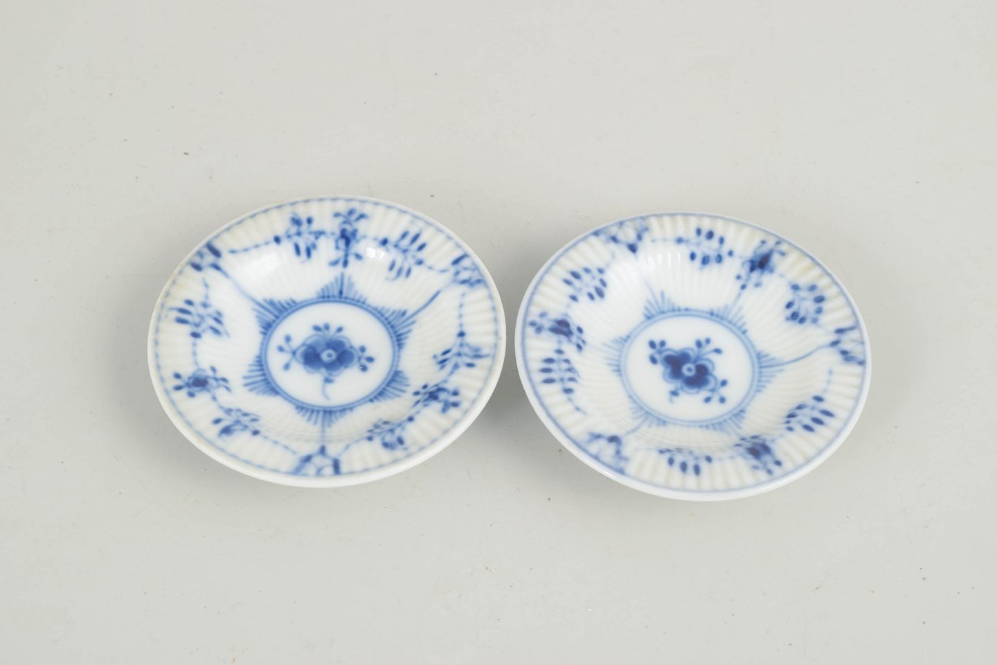 Royal Copenhagen, sæt på to kaviar-fade/kuvertsmør, Musselmalet riflet.Sæt bestående af to små rillede skåle i glaseret porcelæn med håndmalet underglasurdekoration i koboltblå. Lav, rund form med let hævet fod. Model 1/7.