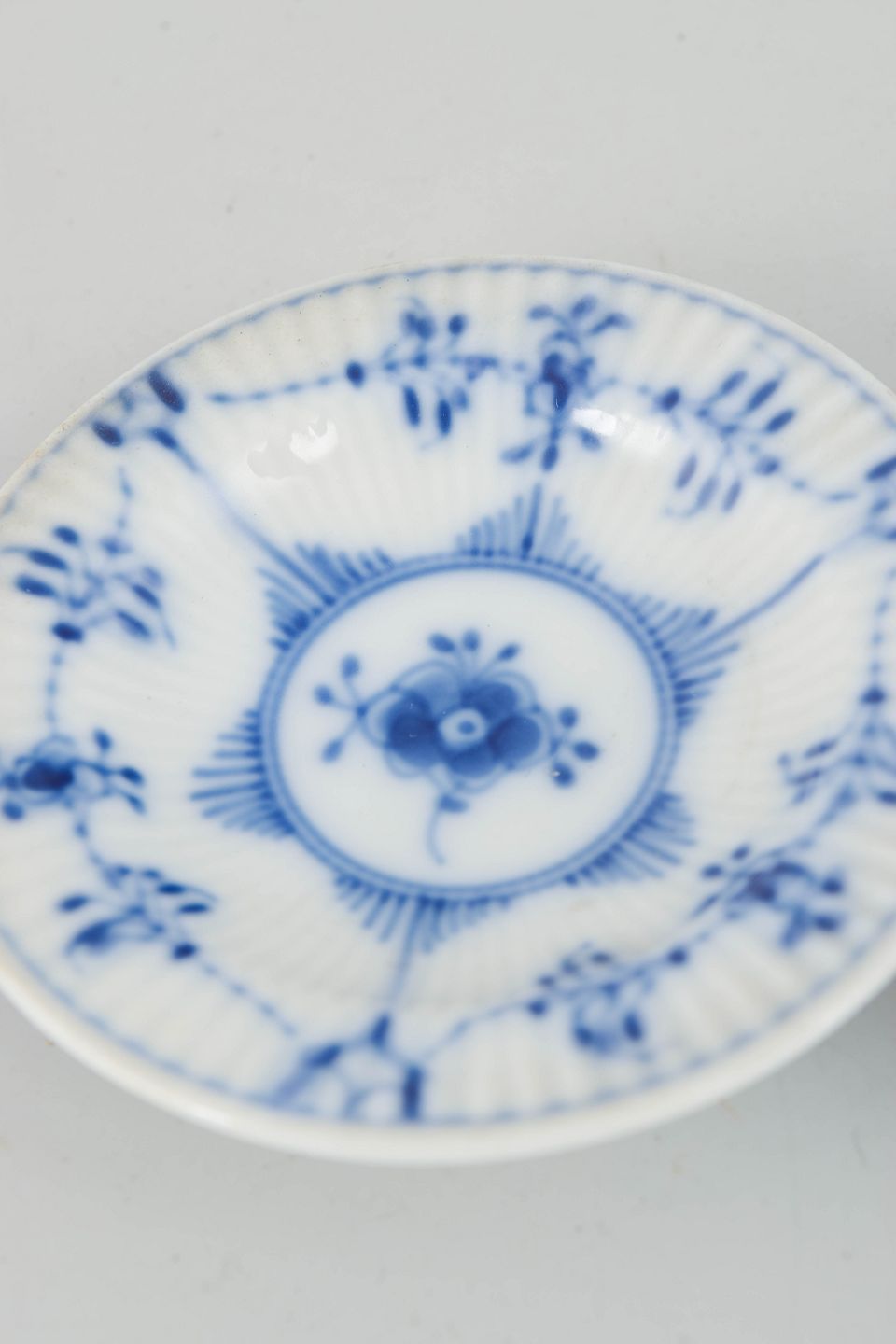 Musselmalet riflet er Royal Copenhagens ældste og mest ikoniske stel, kendetegnet ved den riflede form og det håndmalede blå underglasurmaleri.