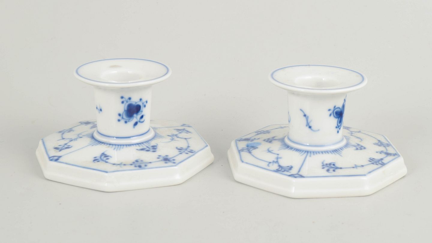 Royal Copenhagen, par lysestager, Musselmalet riflet. 1980´erne.Par rillede lysestager i glaseret porcelæn med håndmalet underglasurdekoration i koboltblå. Ottekantet fod med lav, balanceret profil og cylindrisk lysholder. Model 1/3334.