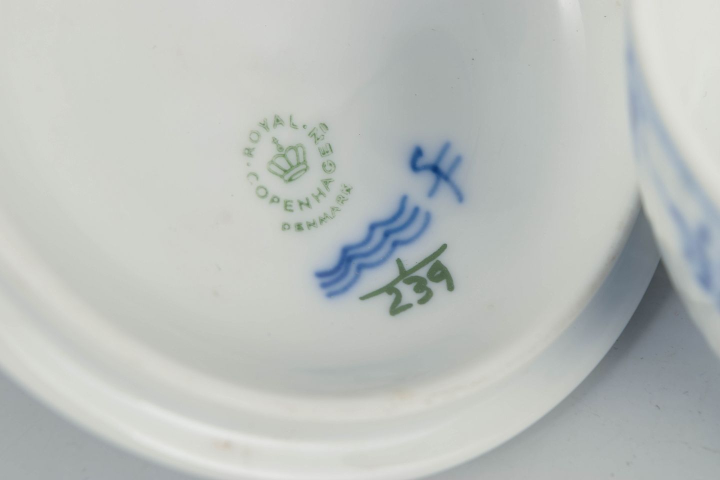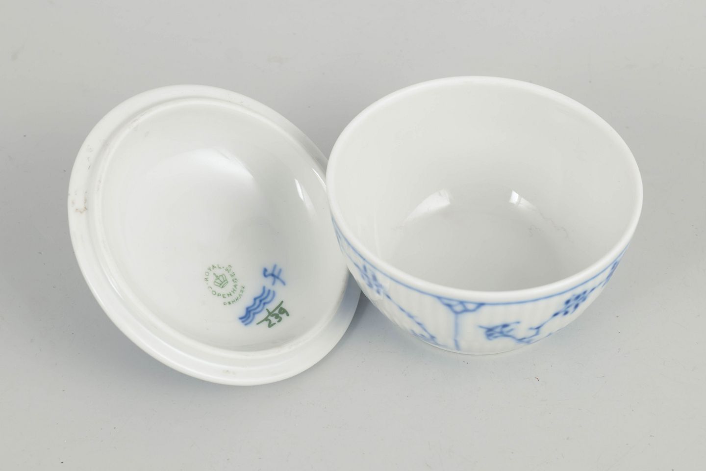 Royal Copenhagen, sukkerskål, Musselmalet riflet.Rillet sukkerskål i glaseret porcelæn med håndmalet underglasurdekoration i koboltblå. Klassisk rund form med tilhørende låg afsluttet med knop.