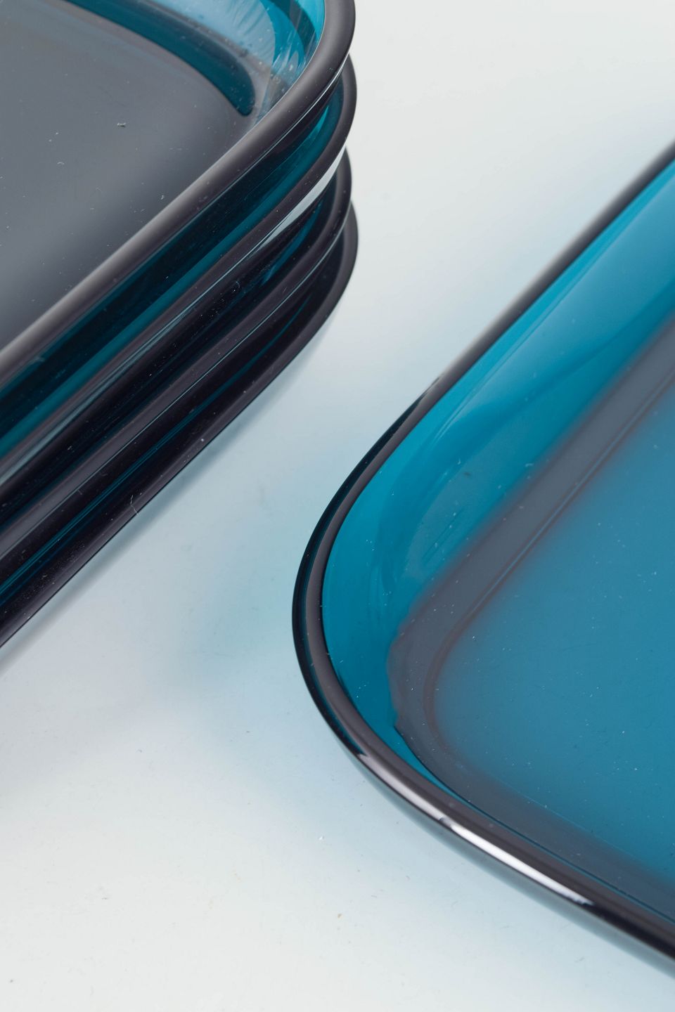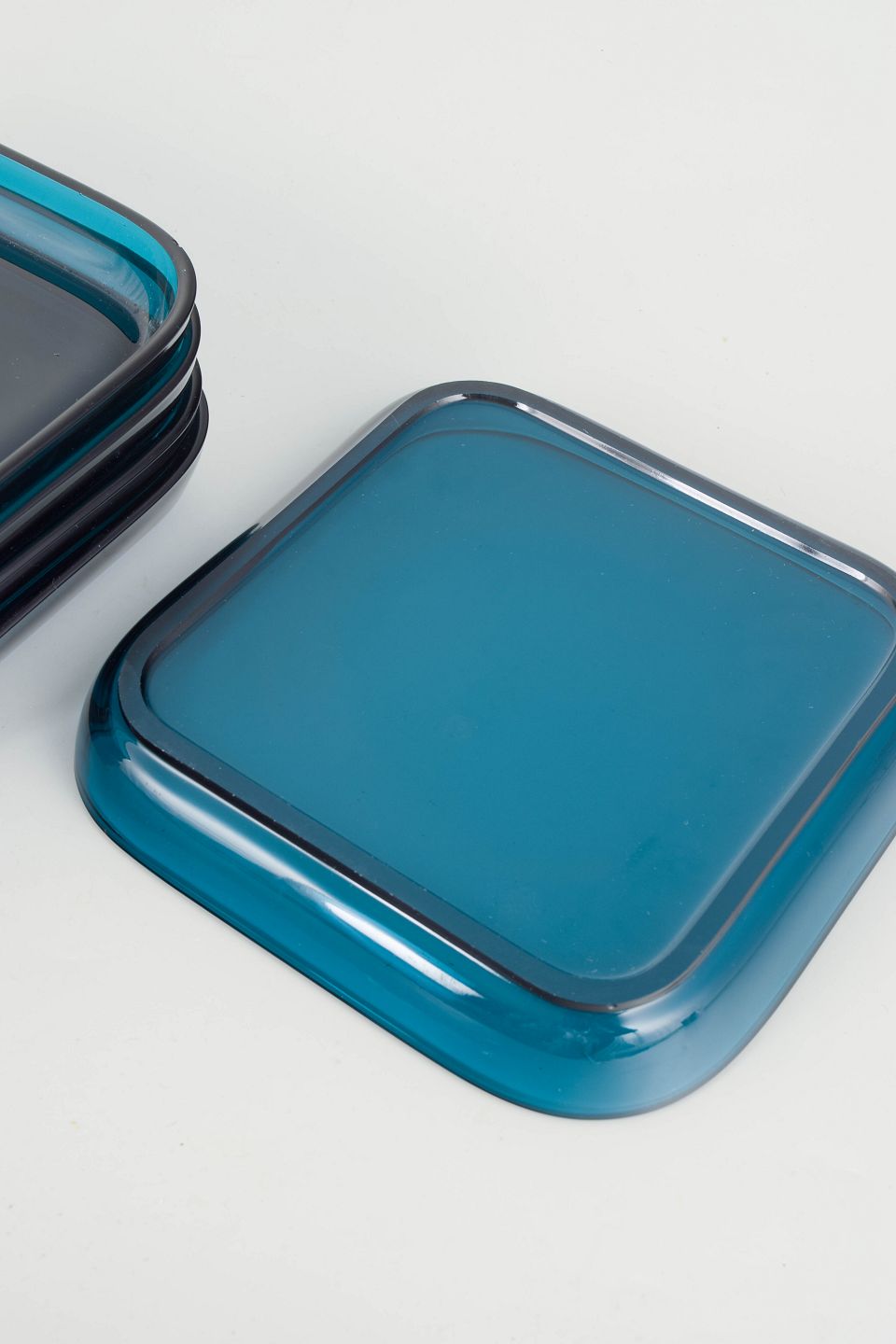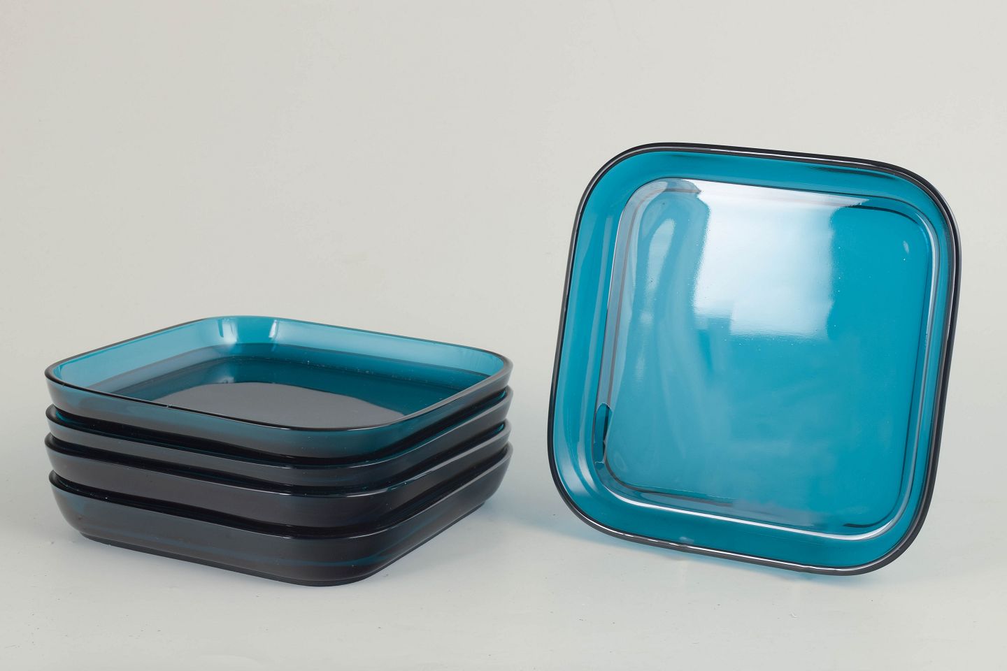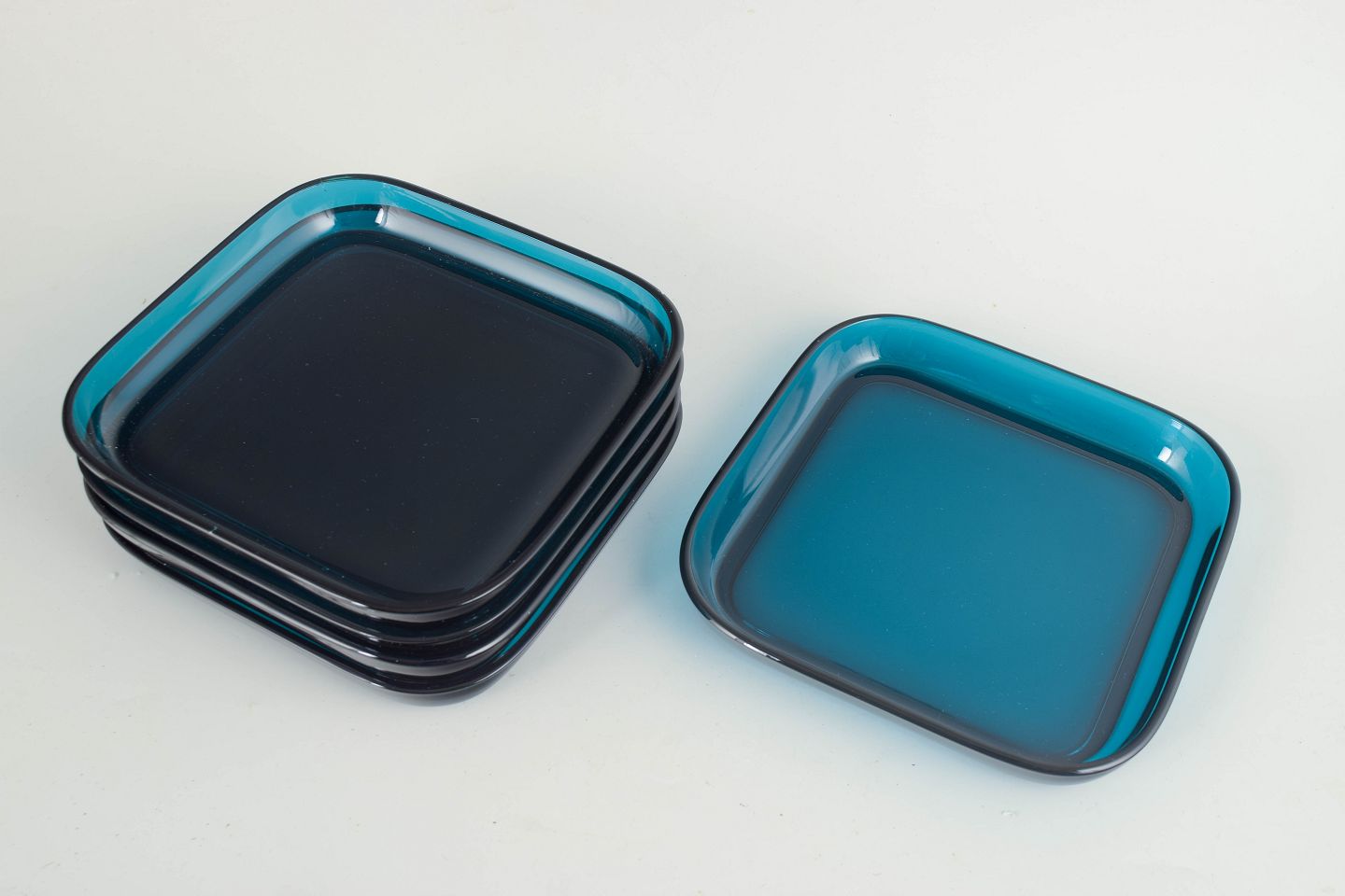 Kaj Frank, sæt på fem kunstglastallerkener.Sæt bestående af fem lave, kvadratiske fade i håndlavet kunstglas med blødt afrundede hjørner og transparent blågrøn tone. Enkelt, stramt formsprog med let hævet kant og glatpoleret overflade, hvor lyset fremhæver glassets dybde og farvespil.