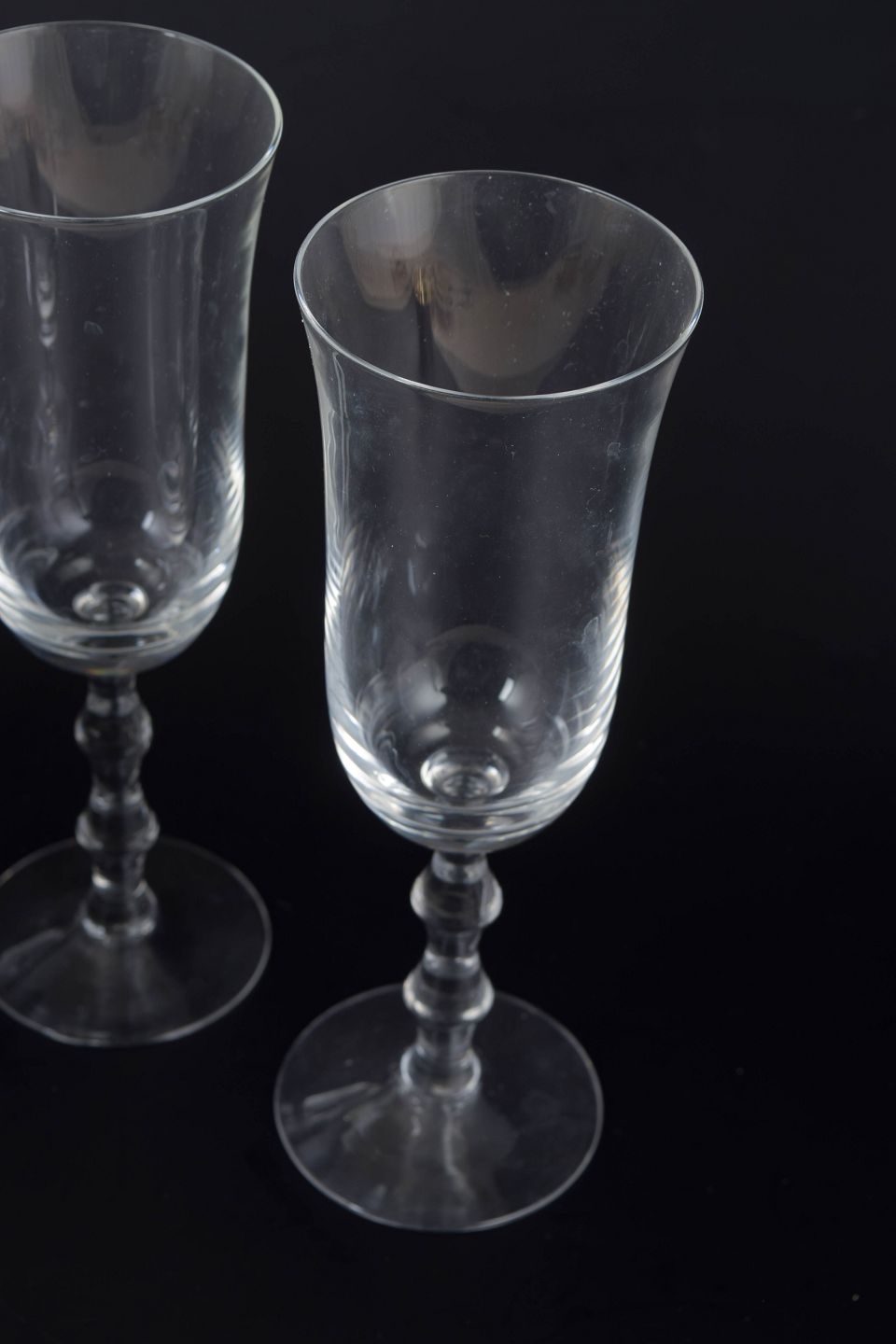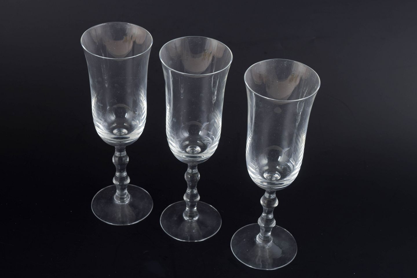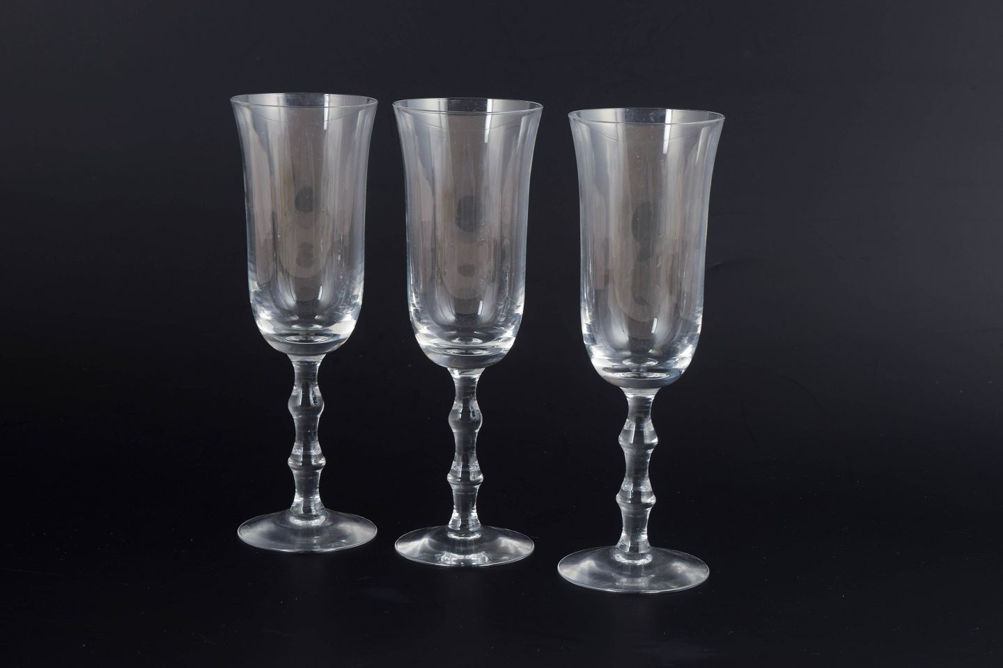 Simon Gate for Orrefors, tre champagneglas.Sæt med tre champagneglas i klart glas med slank kumme og balusterformet stilk på rund fod. Klassisk skandinavisk formsprog med let og elegant proportionering, udført i Orrefors’ karakteristiske klare glaskvalitet. Modellen hedder “Salut”.