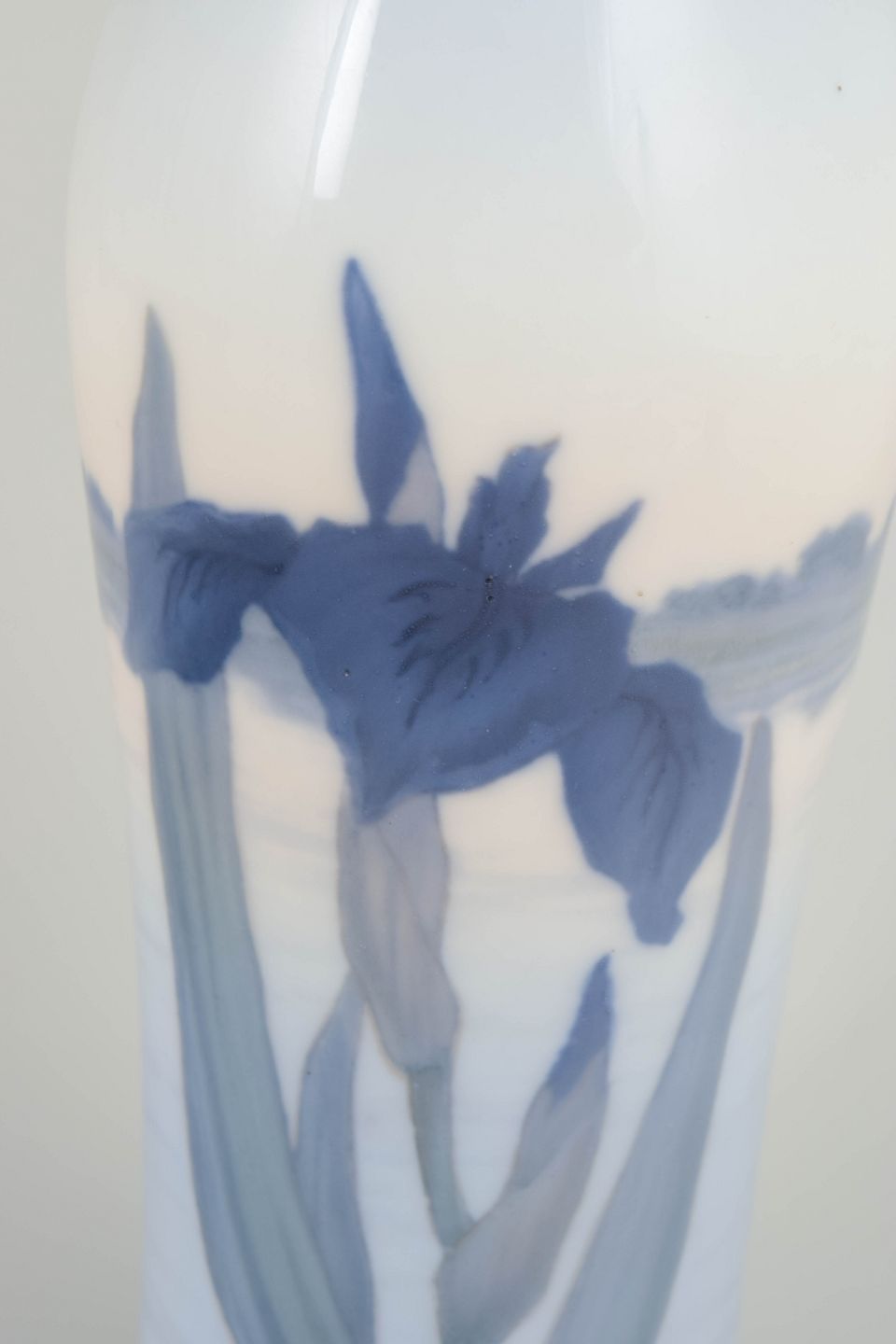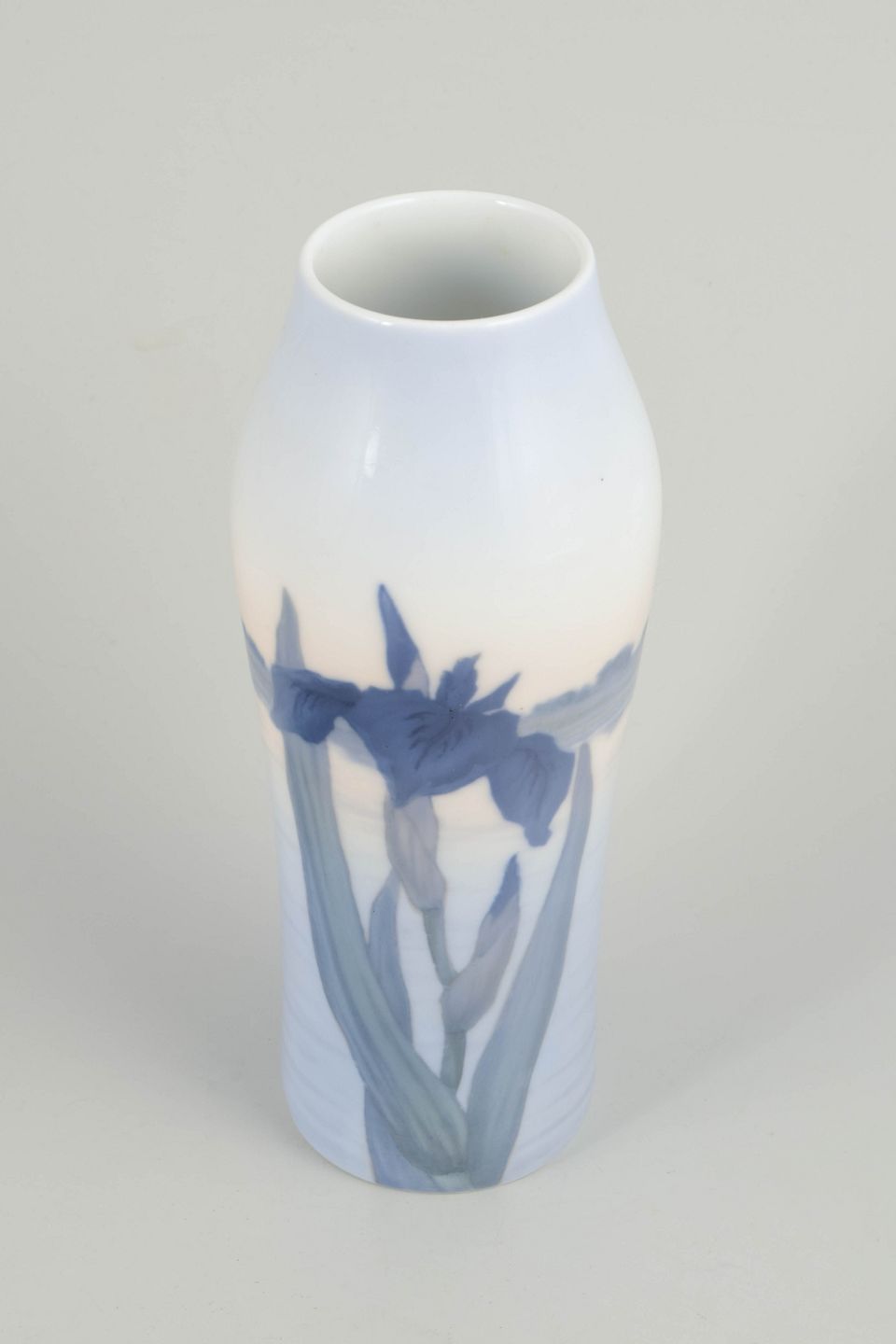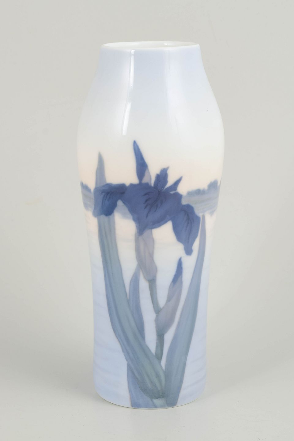 Royal Copenhagen, vase.Høj, let facetteret vase i glaseret porcelæn med håndmalet underglasurdekoration af irisblomster i dybe blå nuancer med grønne stilke, udført mod en lys, let tonet bund. Dekorationen er elegant strakt langs vasens lodrette form og afspejler Royal Copenhagens naturalistiske formsprog i 1920’erne.