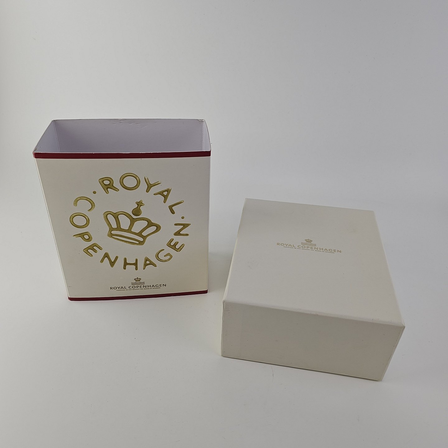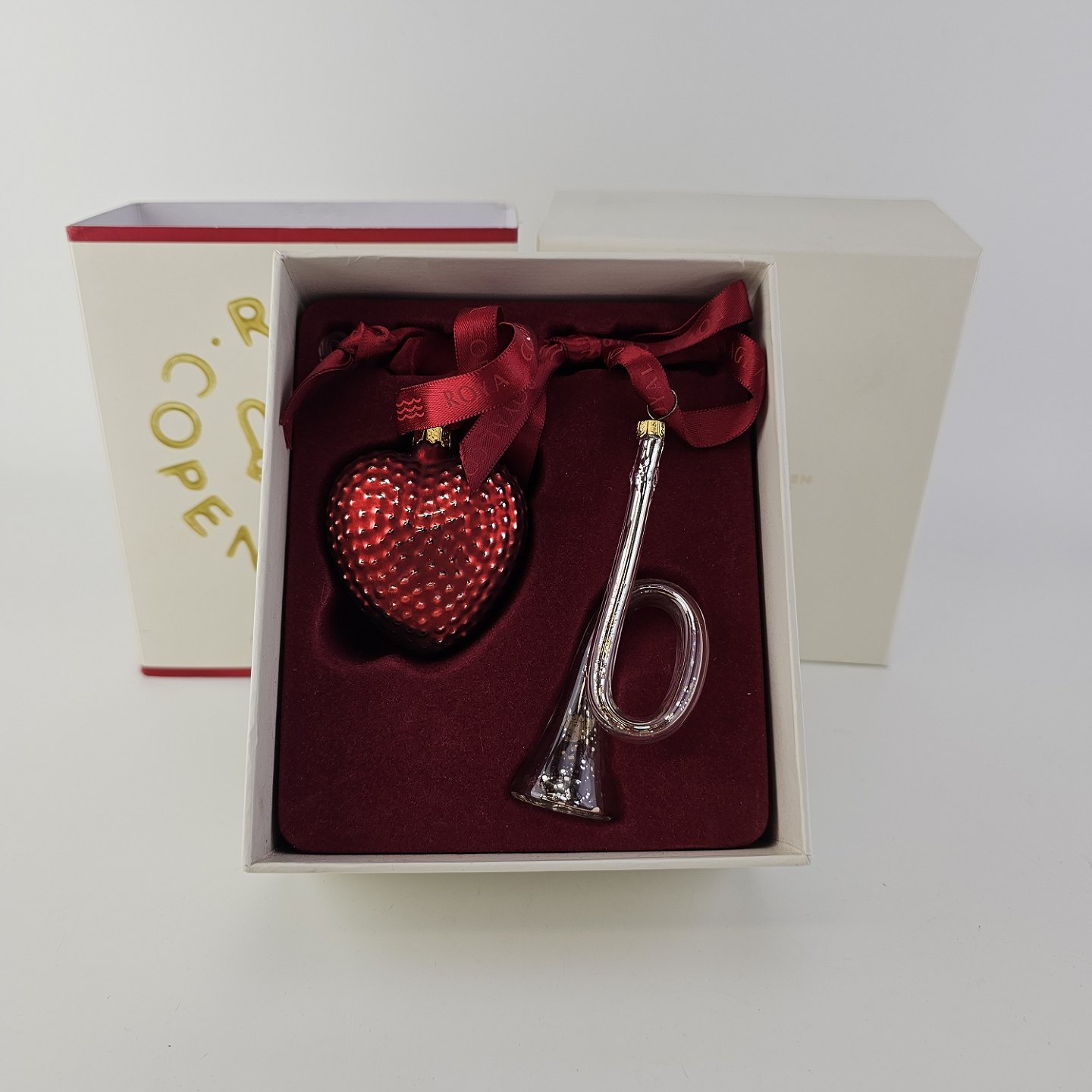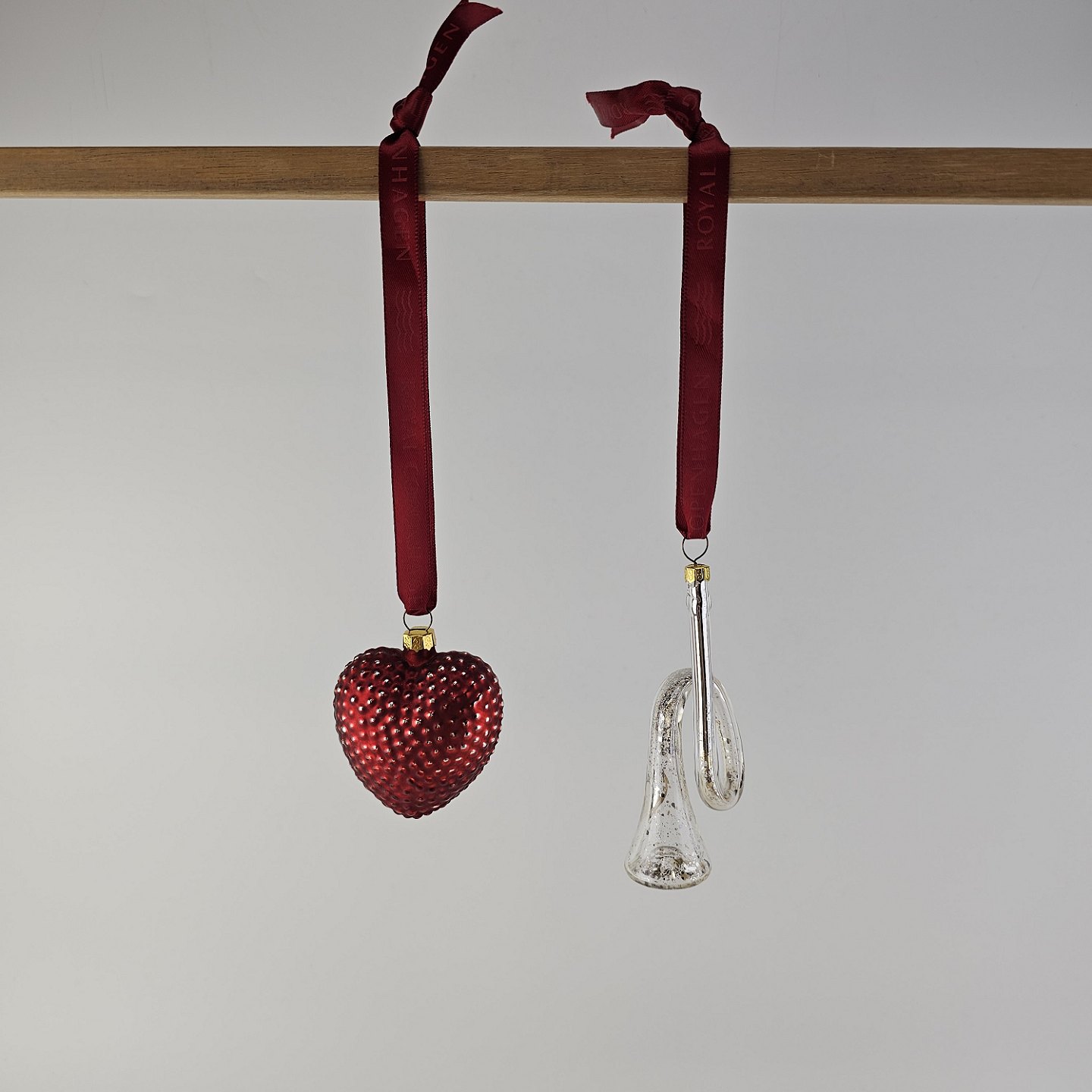 Juleornamenter i glas med motiv af et hjerte og en trompet med rødt bånd til ophængI original kasse