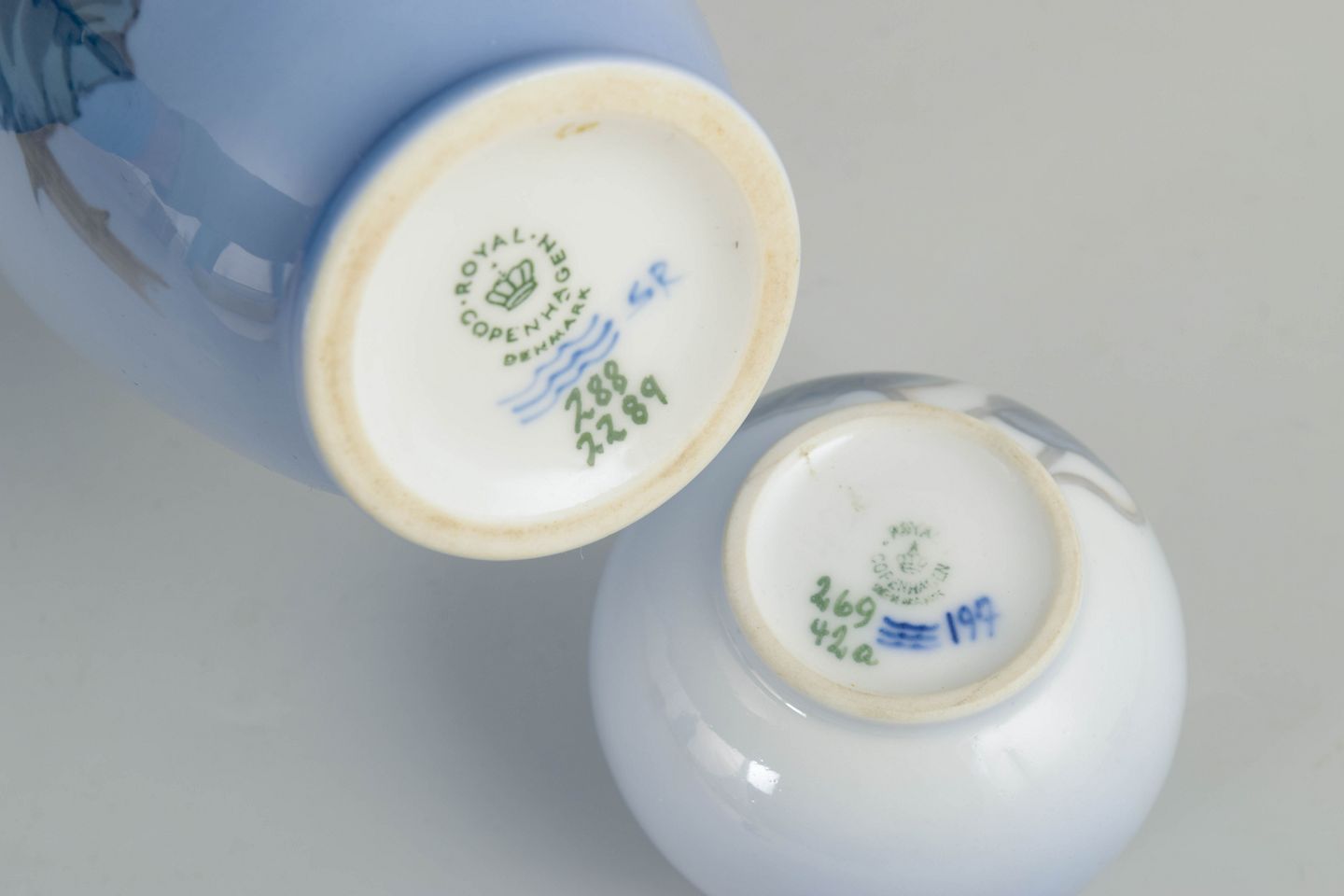 Royal Copenhagen, vaser, sæt af 2.Sæt bestående af to vaser i glaseret porcelæn med håndmalet underglasurdekoration. Den større vase er balusterformet med blomsterdekoration over blåt tonet bundfelt, udført efter model 288/2289. Den mindre vase har rund korpus med floral dekoration i afdæmpede nuancer og er udført efter model 269/42a.