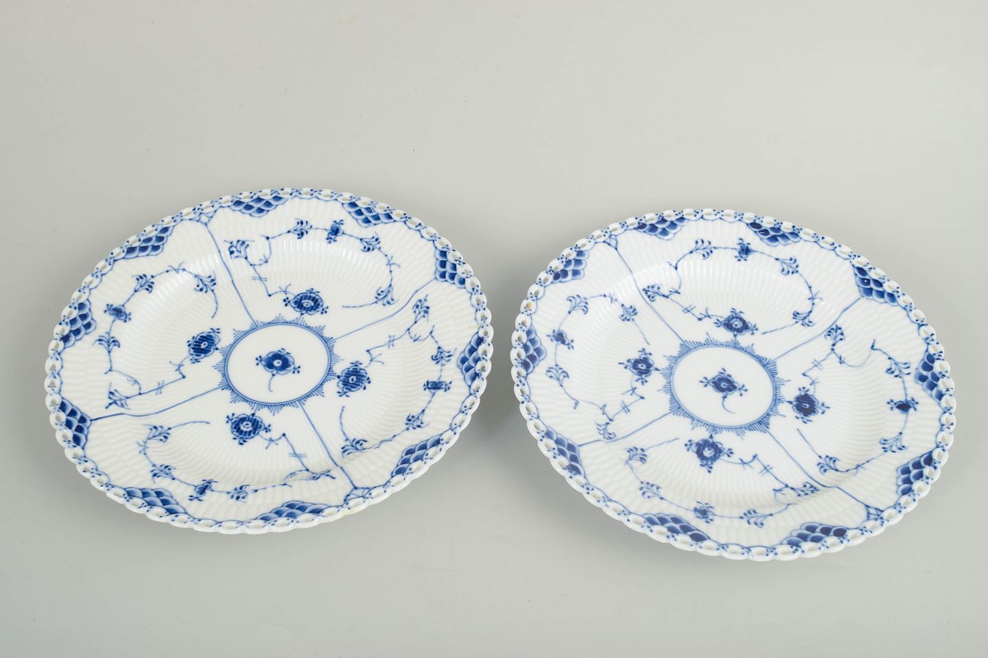 Royal Copenhagen, Musselmalet helblonde middagstallerkener, sæt af 2.Sæt bestående af to tallerkener i glaseret porcelæn med håndmalet underglasurdekoration i det klassiske musselmalede helblonde mønster, kendetegnet ved den gennembrudte blondekant.