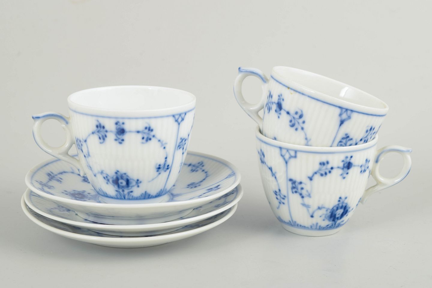 Royal Copenhagen, Musselmalet riflet kaffekopper med tilhørende underkopper, sæt af 3.Sæt bestående af tre kaffekopper med tilhørende underkopper i glaseret porcelæn, dekoreret med håndmalet underglasur i det klassiske musselmalede mønster. Model 1/298.